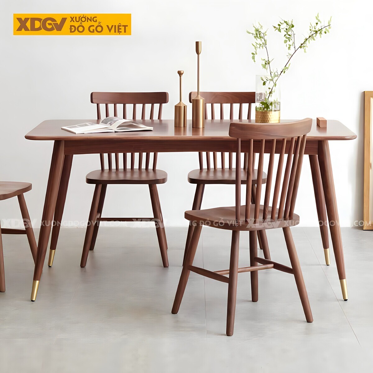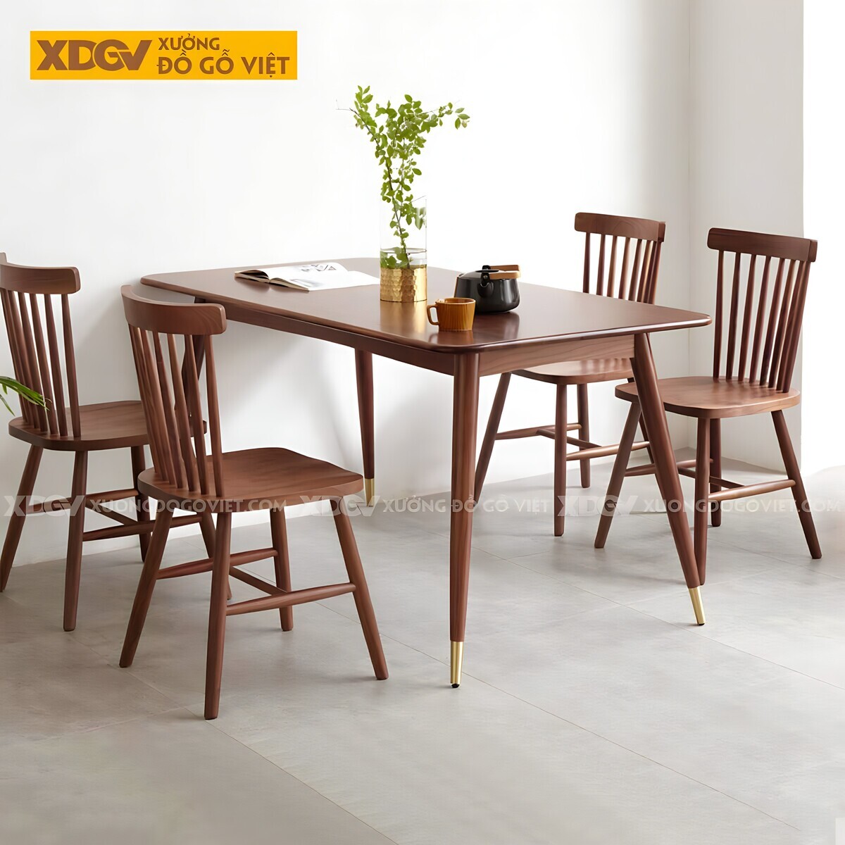 | Điểm nổi bật: | Bàn thon bo góc với 4 chân trụ tròn chắc chắn. Ghế Windsor nhiều nan dọc. Vật liệu gỗ Óc Chó tự nhiên sang trọng & độ bền cao. |