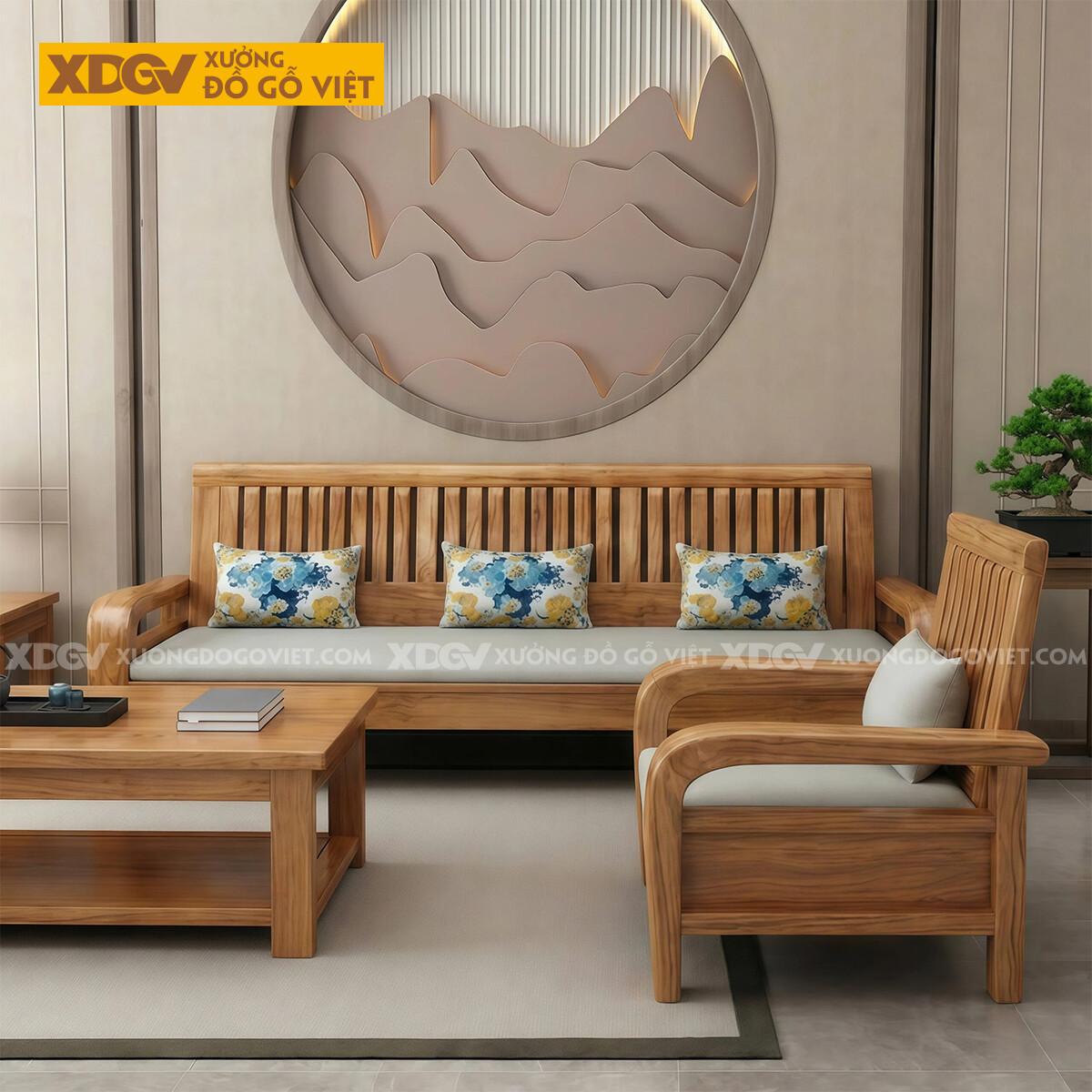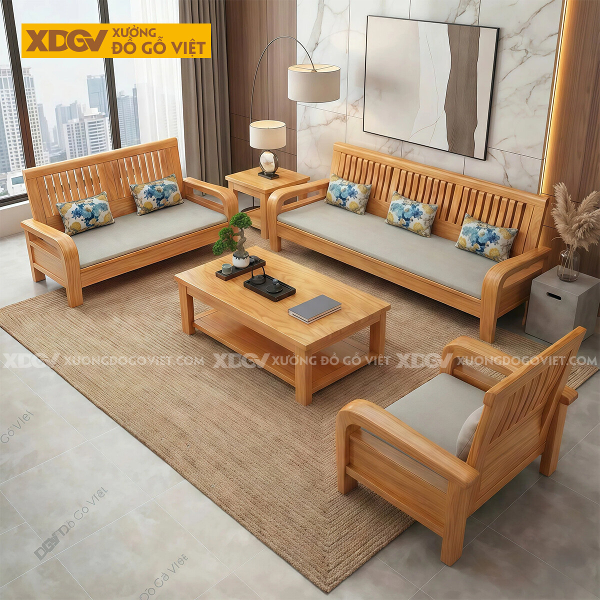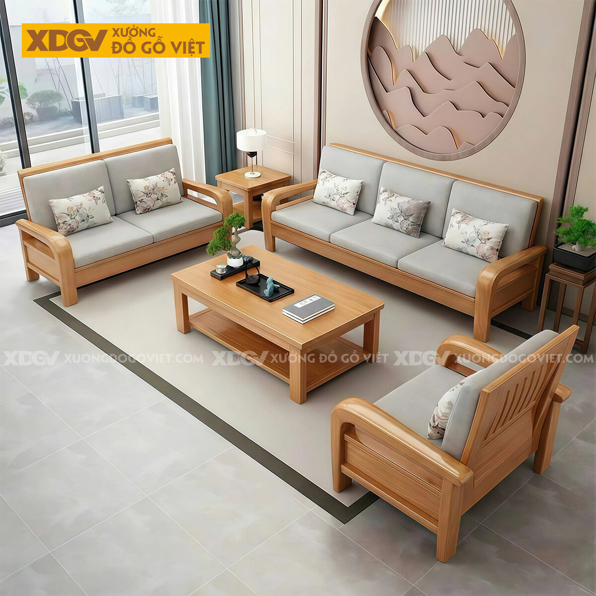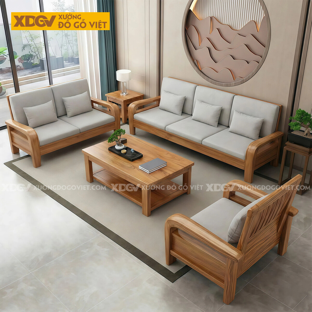 Kích thước bài trí nguyên bộ: Dài 330cm x Rộng 220cm x Cao 89cm (Tay 12cm, gỗ dày 4-5cm).