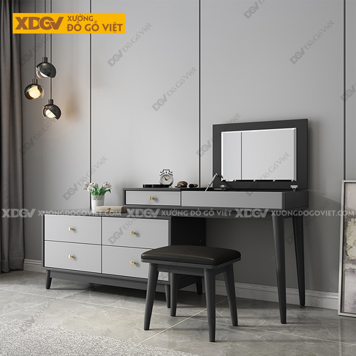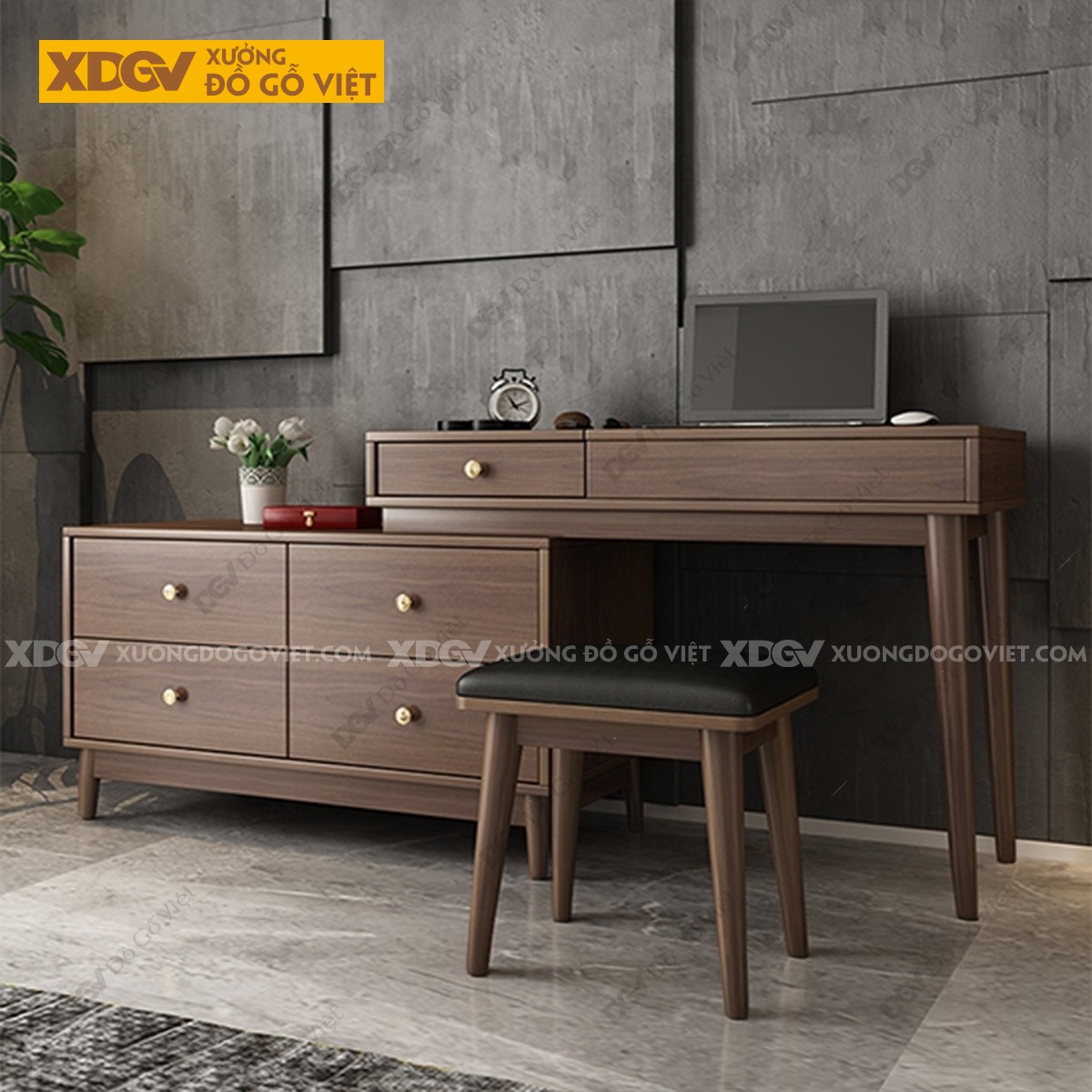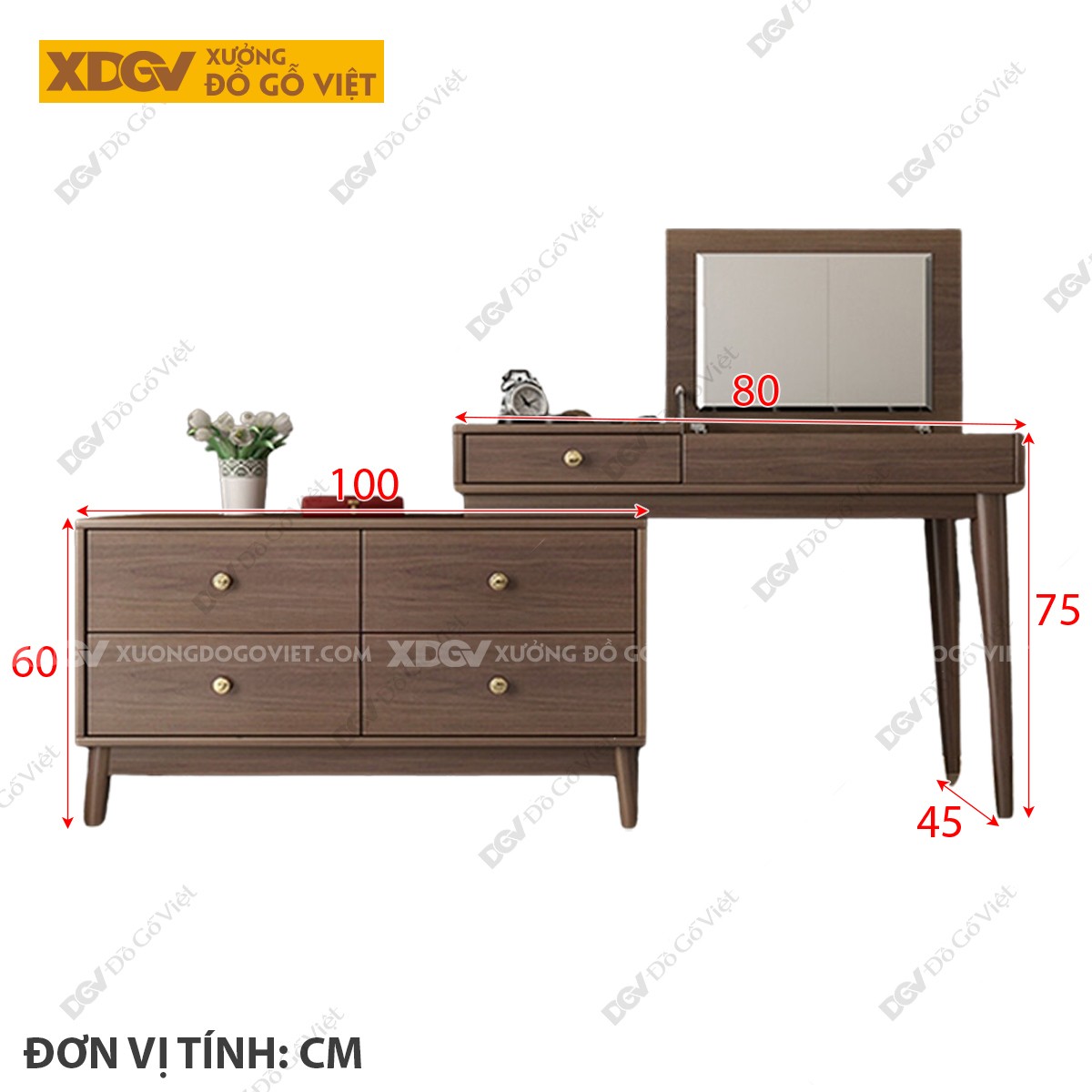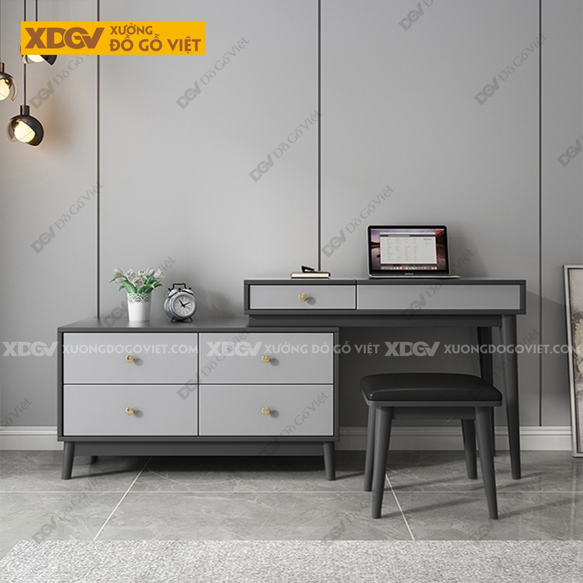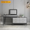 Chất liệu: MDF lõi xanh chống ẩm phủ Melamine chống trầy, chân trụ gỗ cao su.