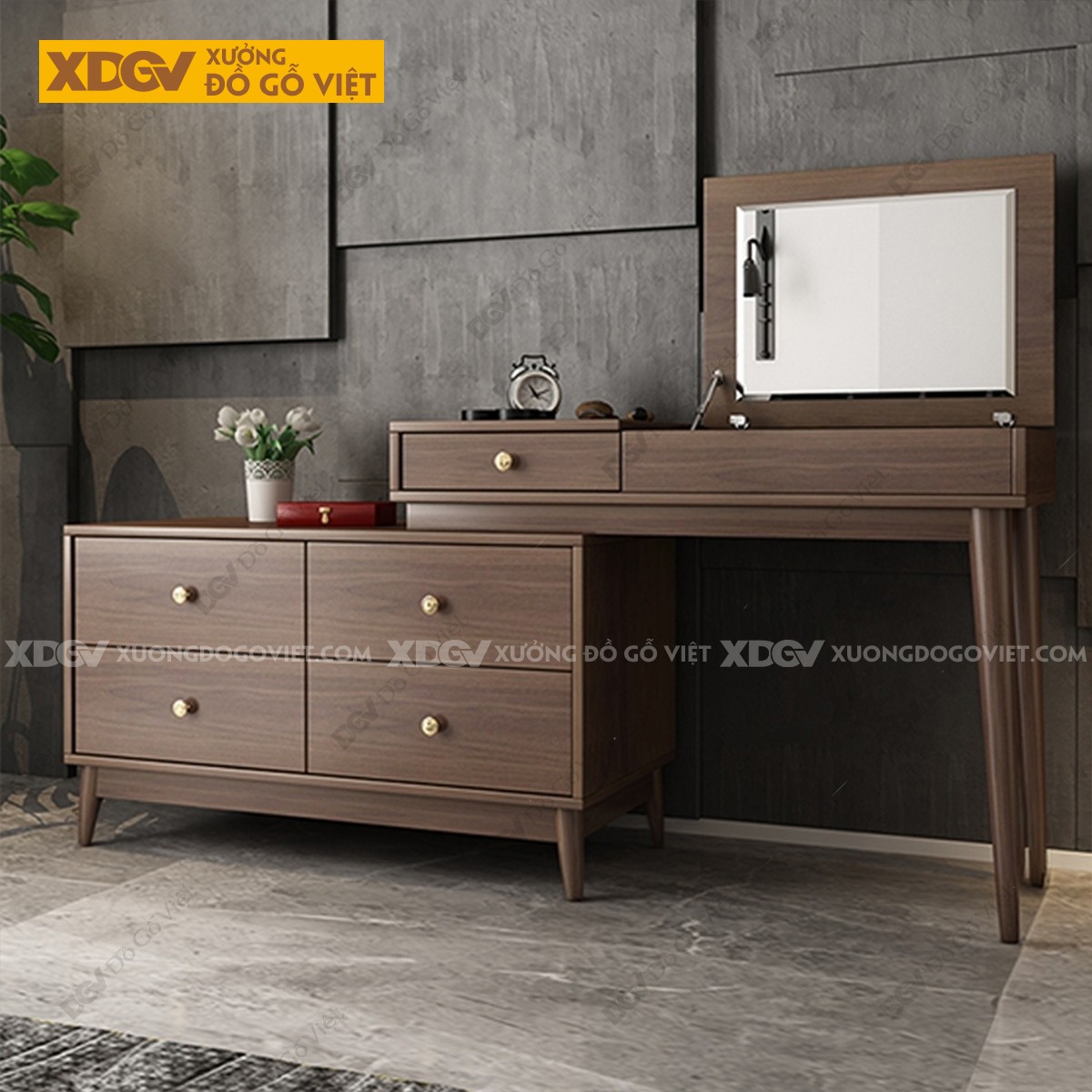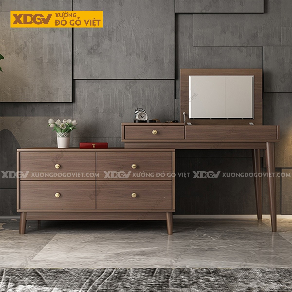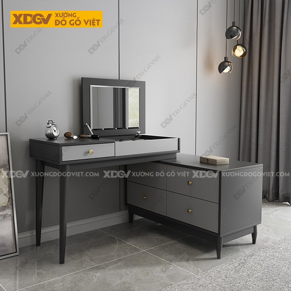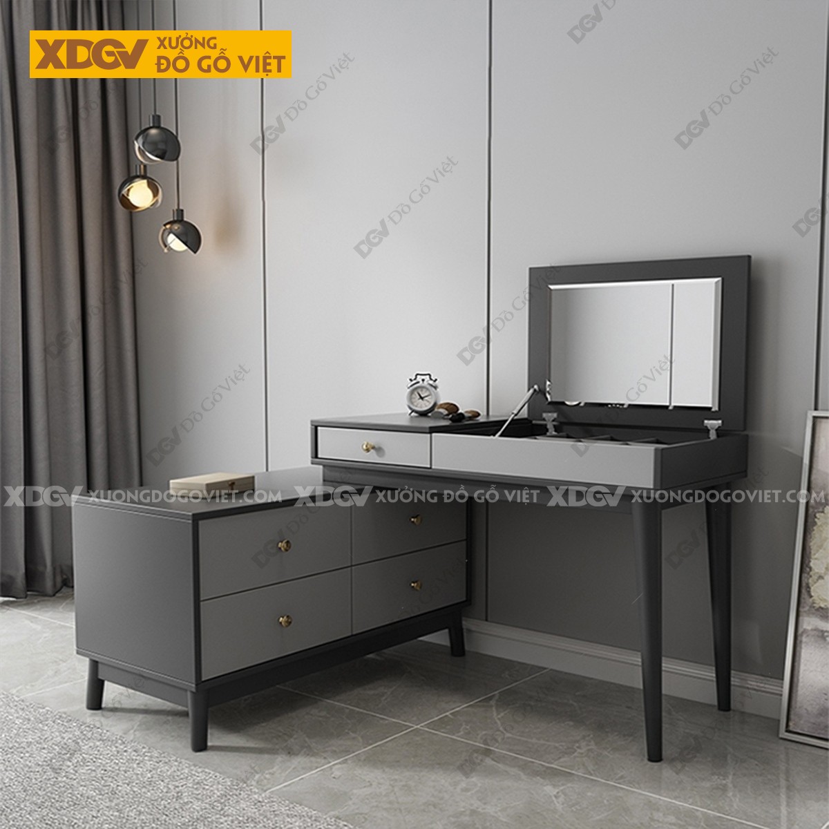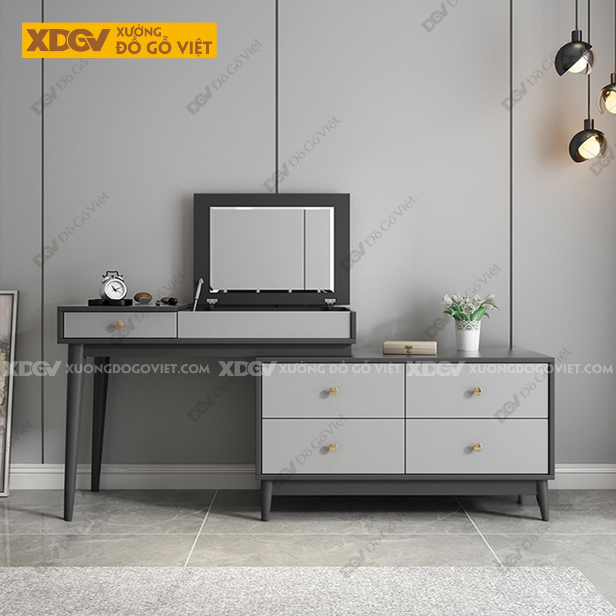Chất liệu: MDF lõi xanh chống ẩm phủ Melamine chống trầy, chân trụ gỗ cao su.
