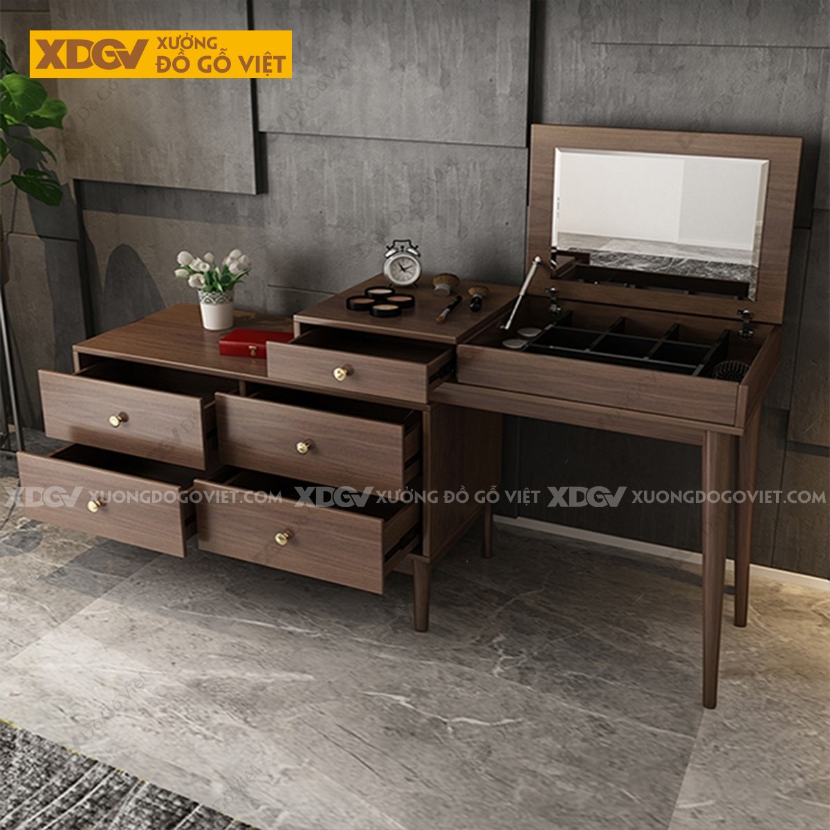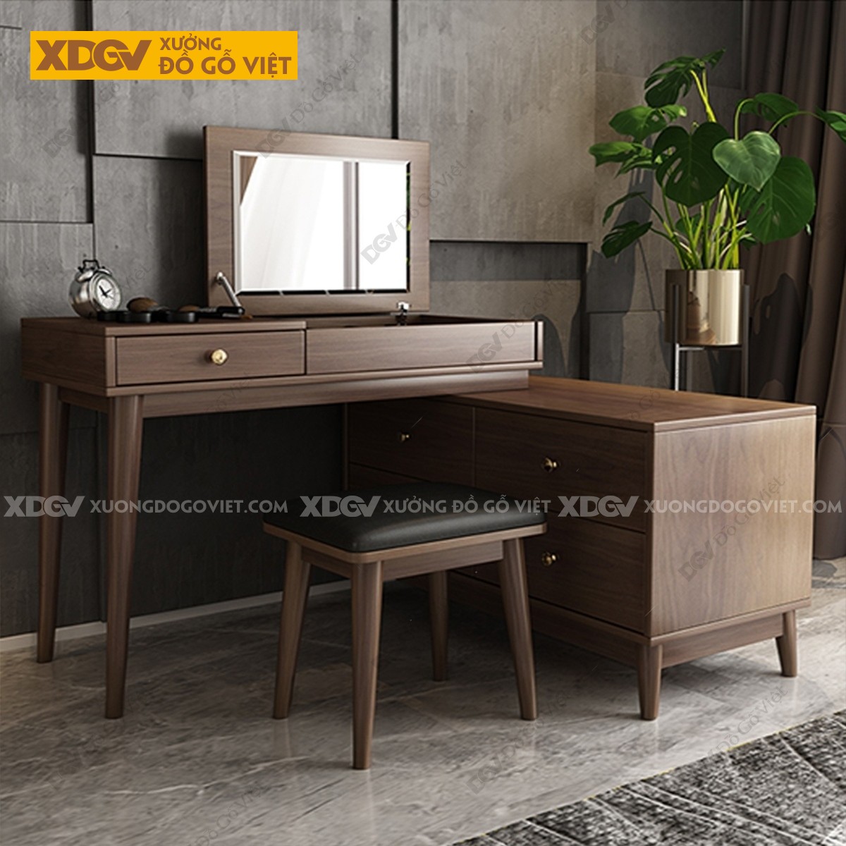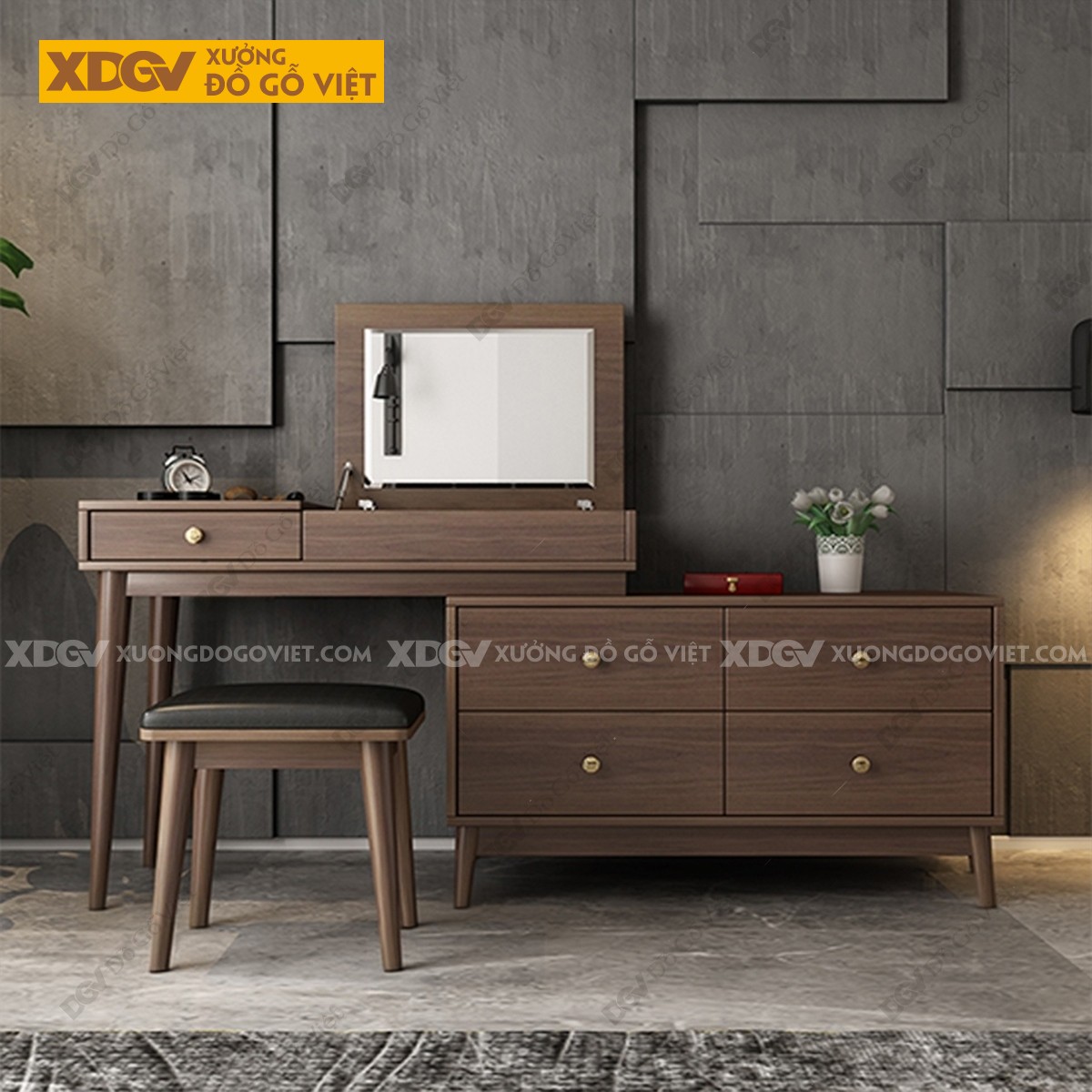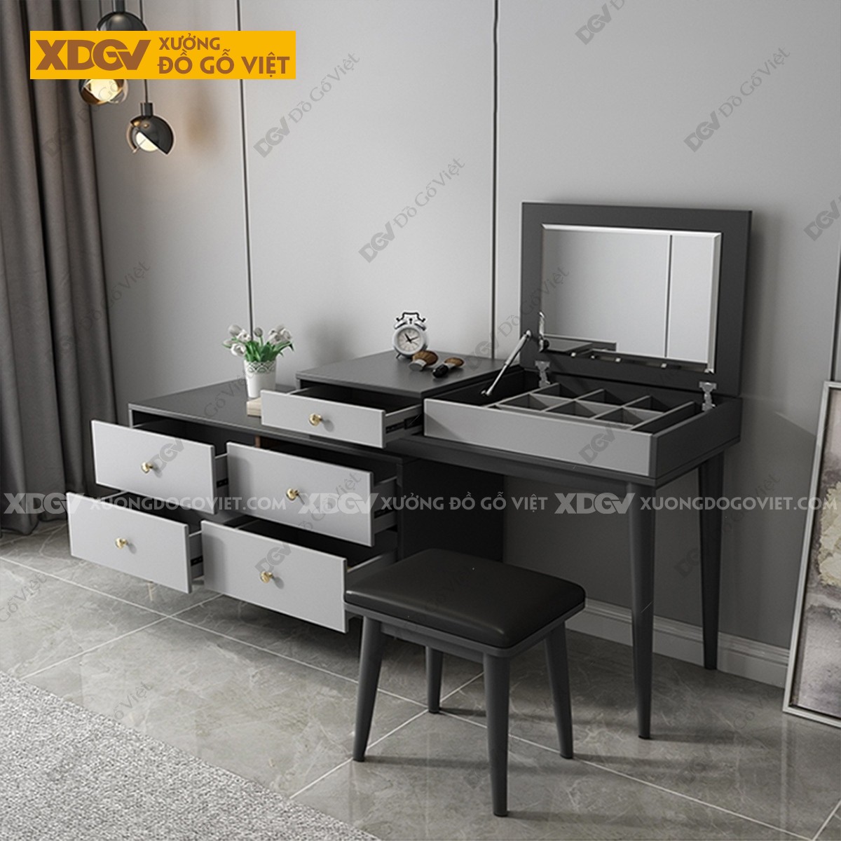 Chất liệu: MDF lõi xanh chống ẩm phủ Melamine chống trầy, chân trụ gỗ cao su.