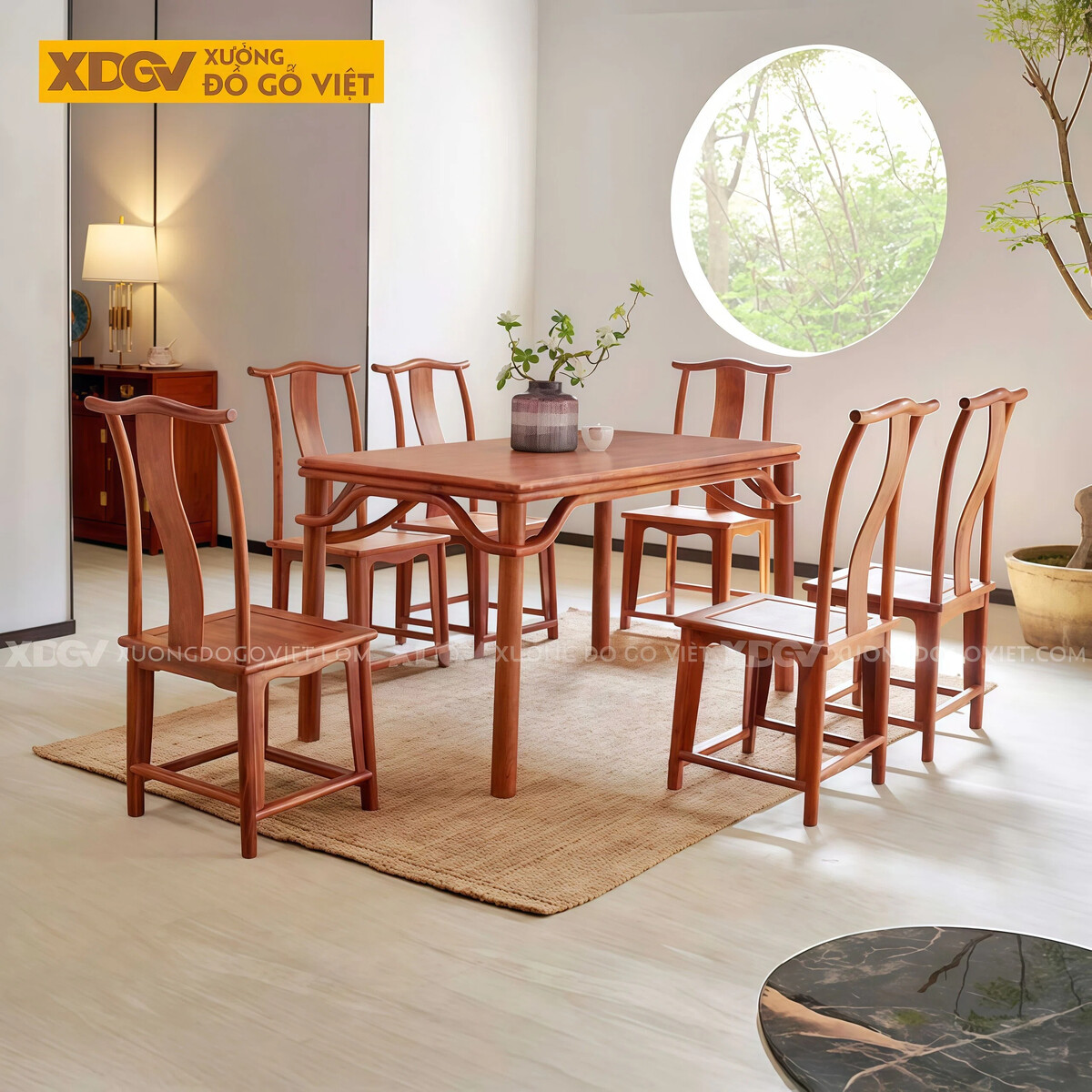 Bộ bàn ăn này là một tuyên ngôn táo bạo về phong cách Á Đông Đương Đại (Contemporary Asian), nơi các giá trị truyền thống được làm mới bằng một tư duy thiết kế đầy tính nghệ thuật và phá cách. Nền tảng là dáng ghế "Mũ Quan", là chất gỗ gõ đỏ, là kỹ thuật mộc gia truyền; nhưng được thể hiện bằng một ngôn ngữ điêu khắc hiện đại qua dáng bàn độc đáo.