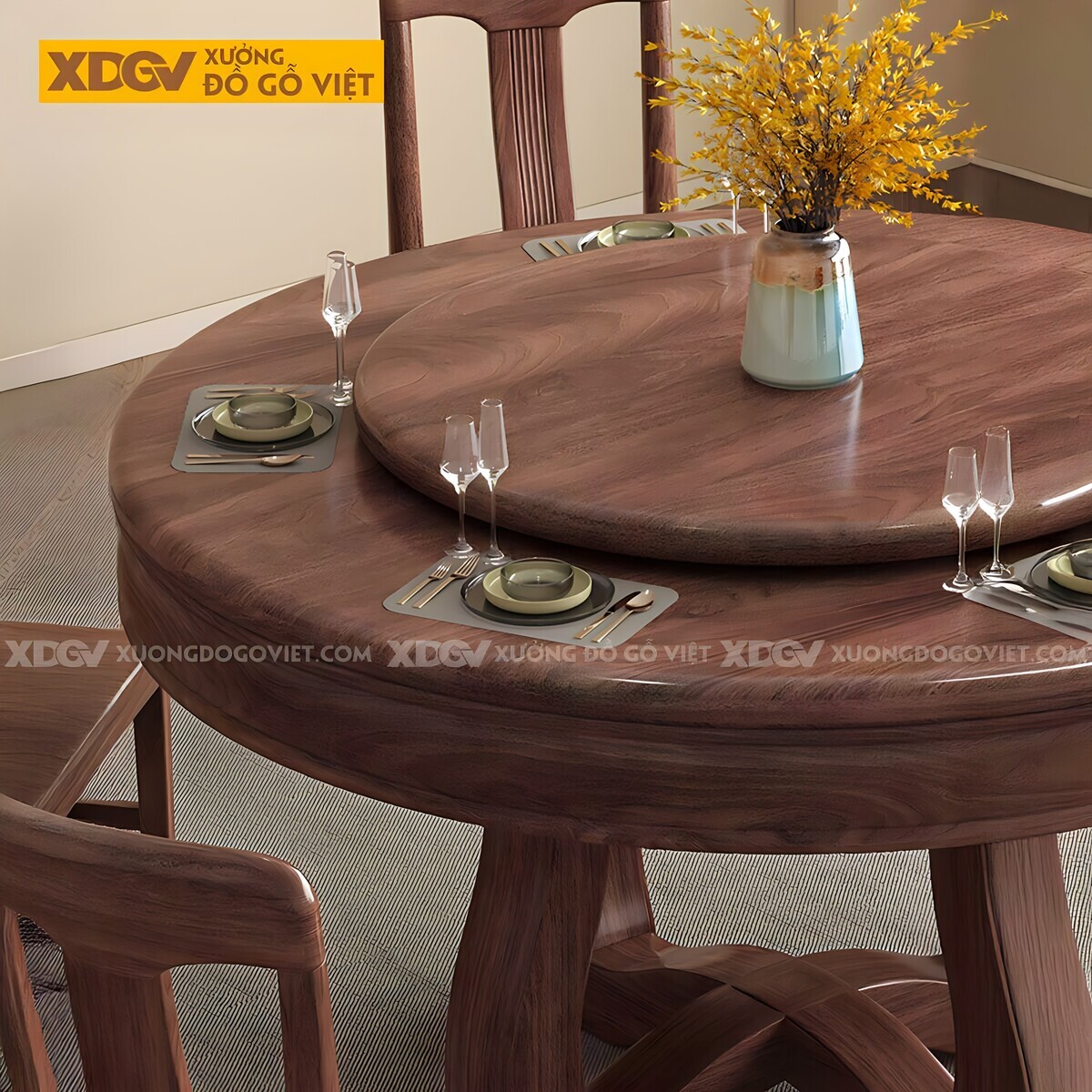 Hoàn thiện cao cấp: Bề mặt được phủ sơn PU bền đẹp cùng mâm xoay gỗ nguyên khối tiện lợi, tối ưu cho những bữa tiệc sum vầy.