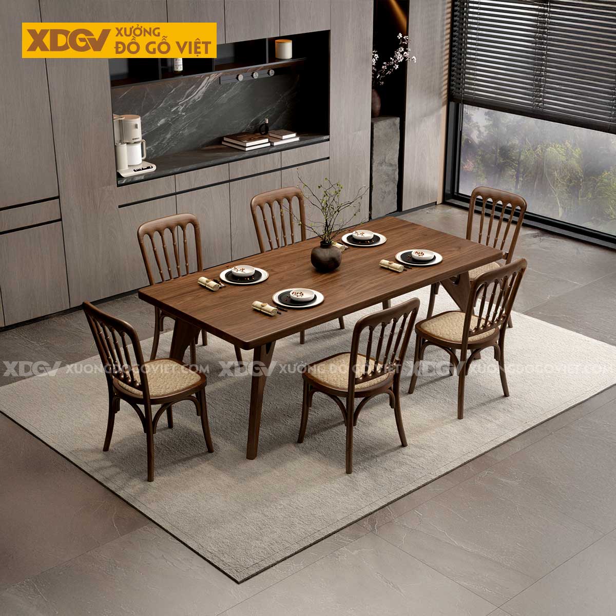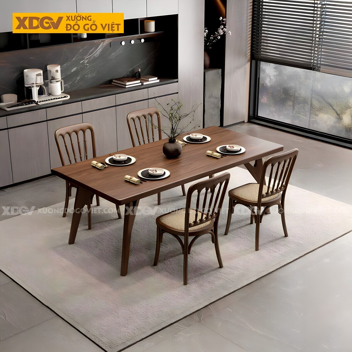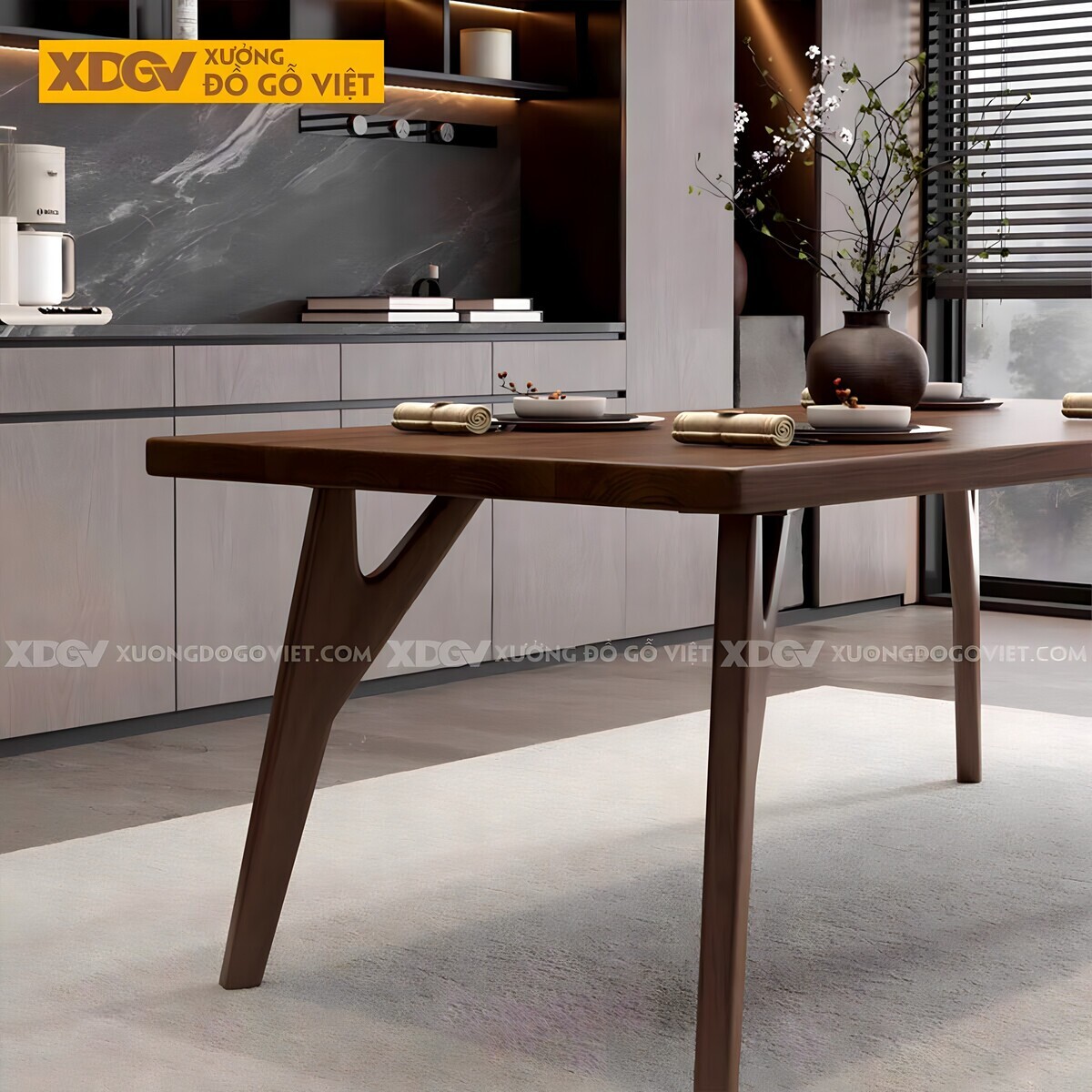Bàn ăn gỗ Óc Chó nhập khẩu chính ngạch từ Mỹ, sản xuất tại Xưởng Đồ Gỗ Việt. Sự thành công của thiết kế chiết trung này nằm ở việc sử dụng vật liệu một cách thông minh để tạo ra sự kết nối.
