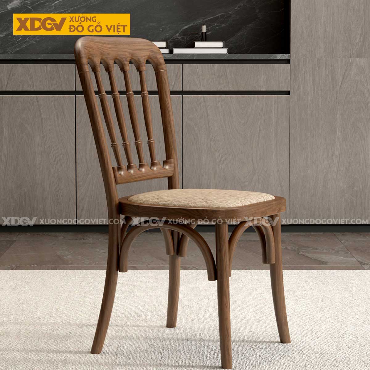 Kiểu dáng cổ điển: Dáng ghế với lưng tựa cao, các nan dọc và những đường cong mềm mại gợi nhớ đến những chiếc ghế Thonet kinh điển hoặc ghế trong các quán cà phê cổ ở Paris, tạo ra một cảm giác hoài niệm và đầy lãng mạn.