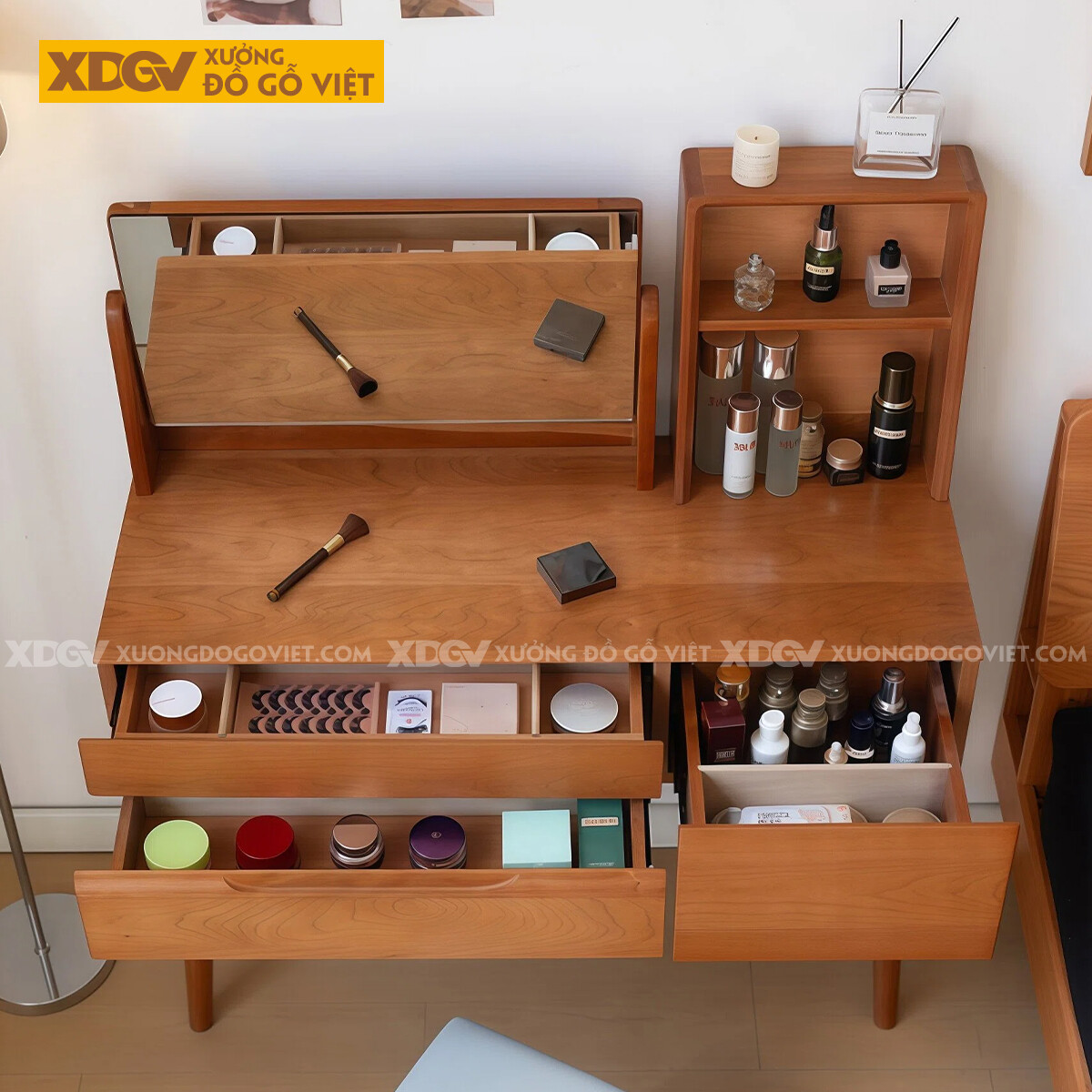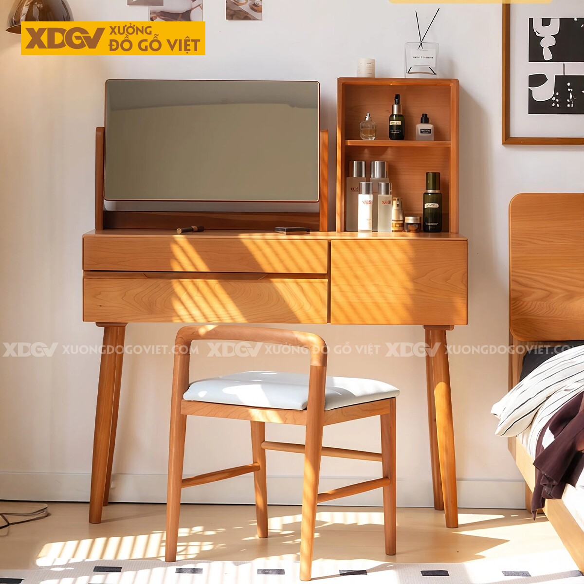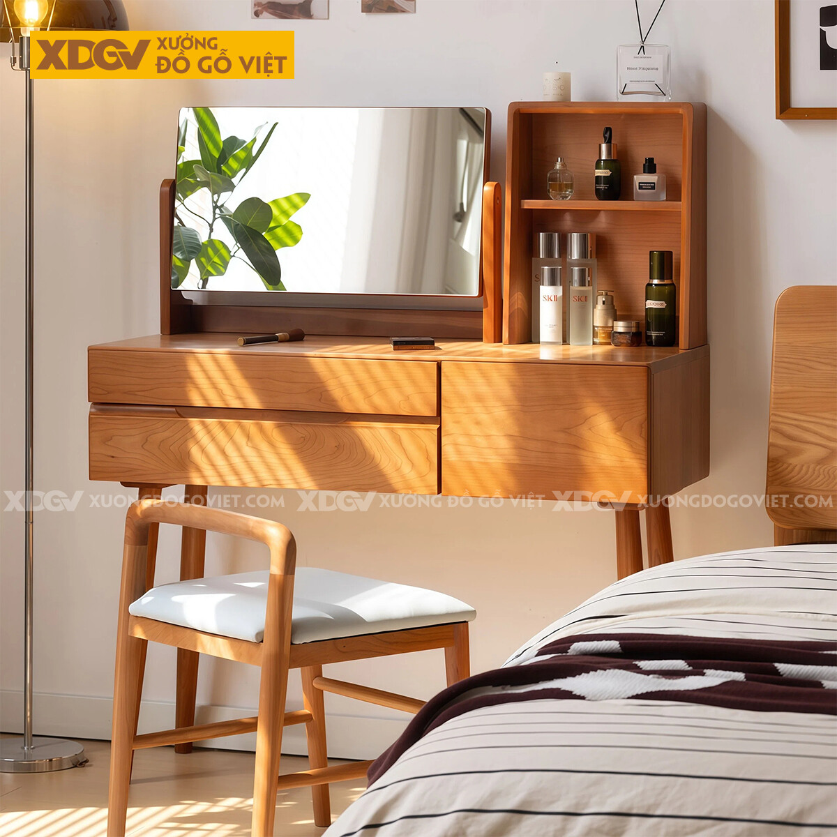Bộ Bàn Trang Điểm Phòng Ngủ Gỗ Sồi Bo Góc Chân Côn Kèm Gương