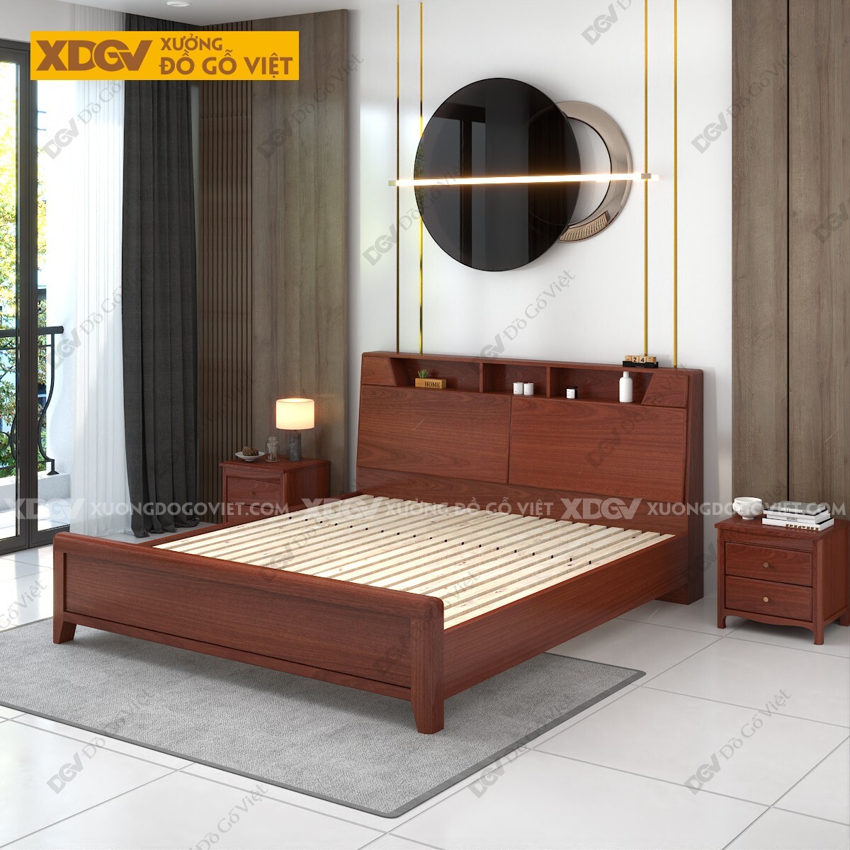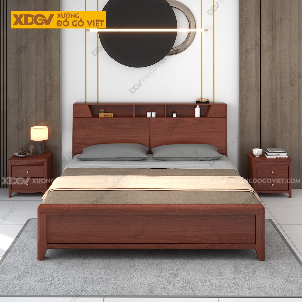 Giường Ngủ Veneer Xoan Đào Kèm Kệ Giường Trên Trang Trí