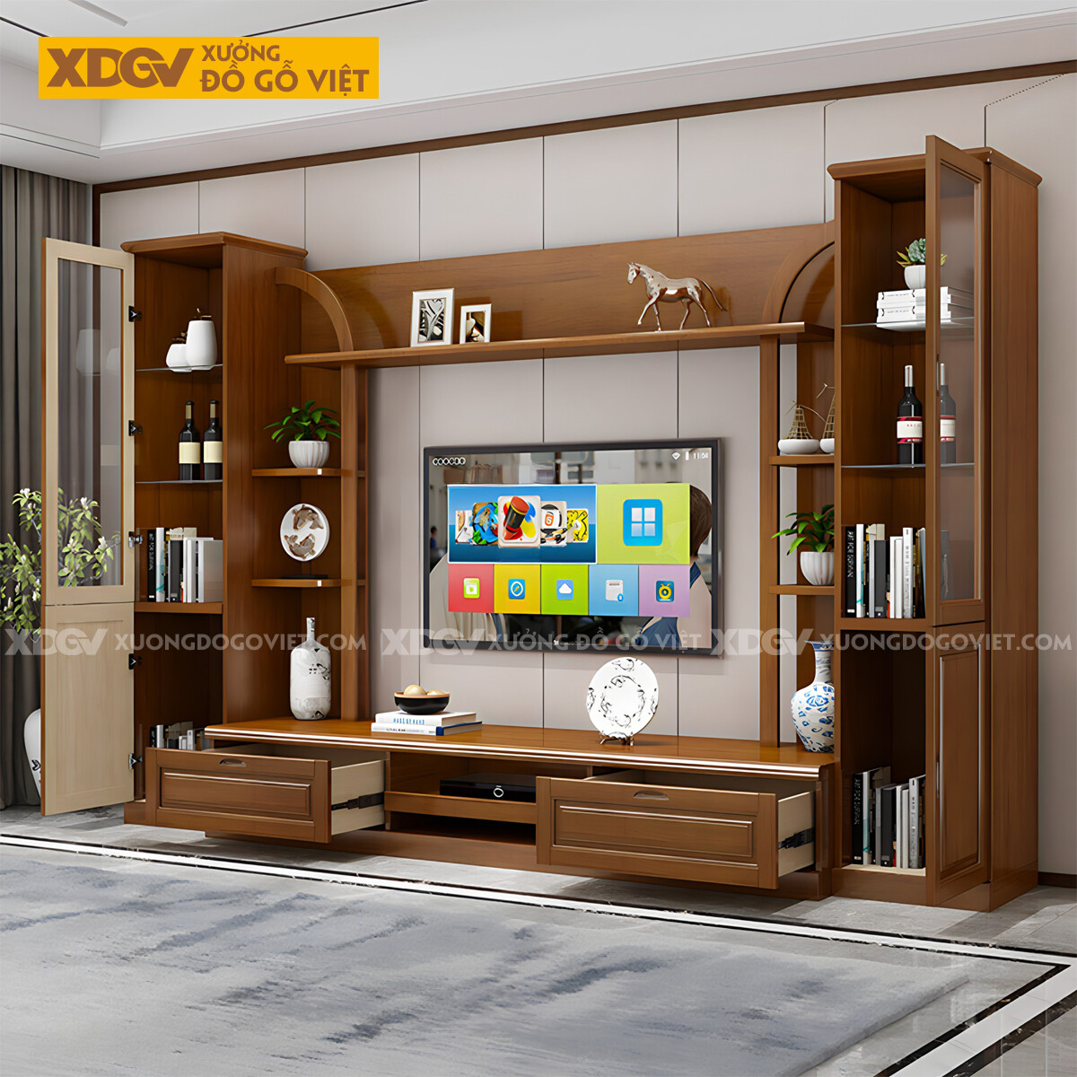 Kệ Tivi Gỗ Sồi Kết Hợp Tủ Kính Và Kệ Trang Trí Phòng Khách