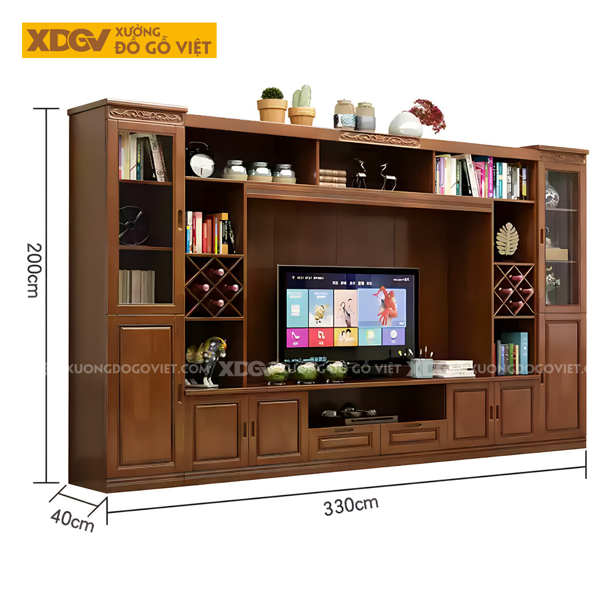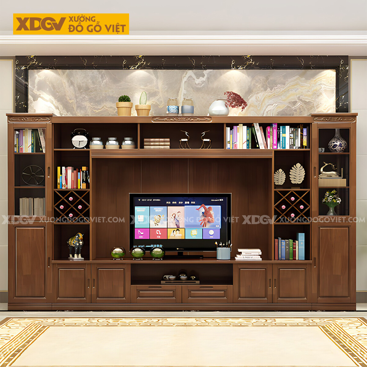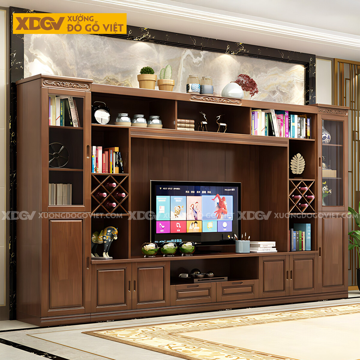 Kệ Tivi Kèm Tủ Gỗ Sồi Có Ngăn Để Rượu Chạm Họa Tiết Trên Nóc