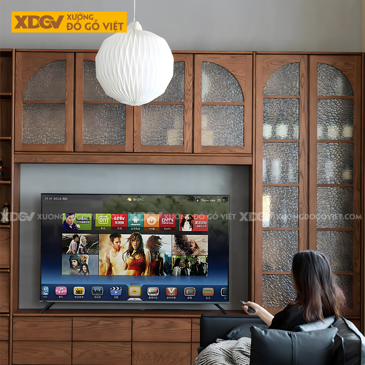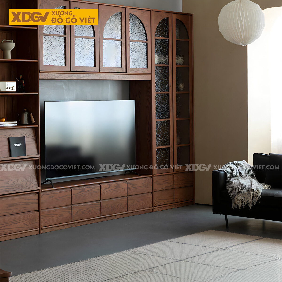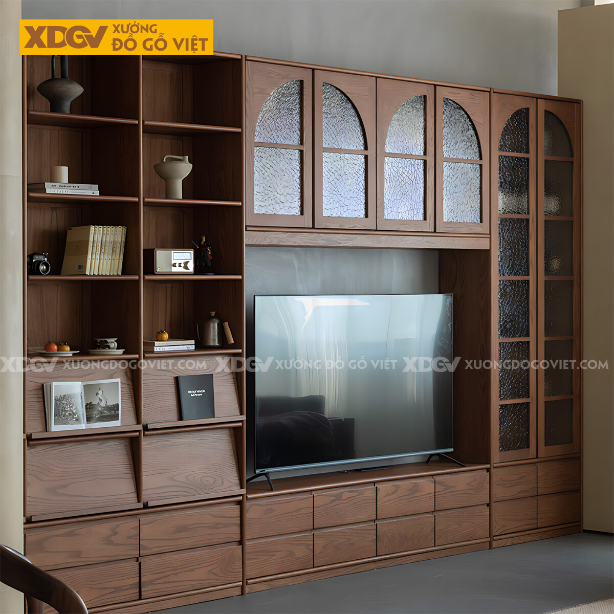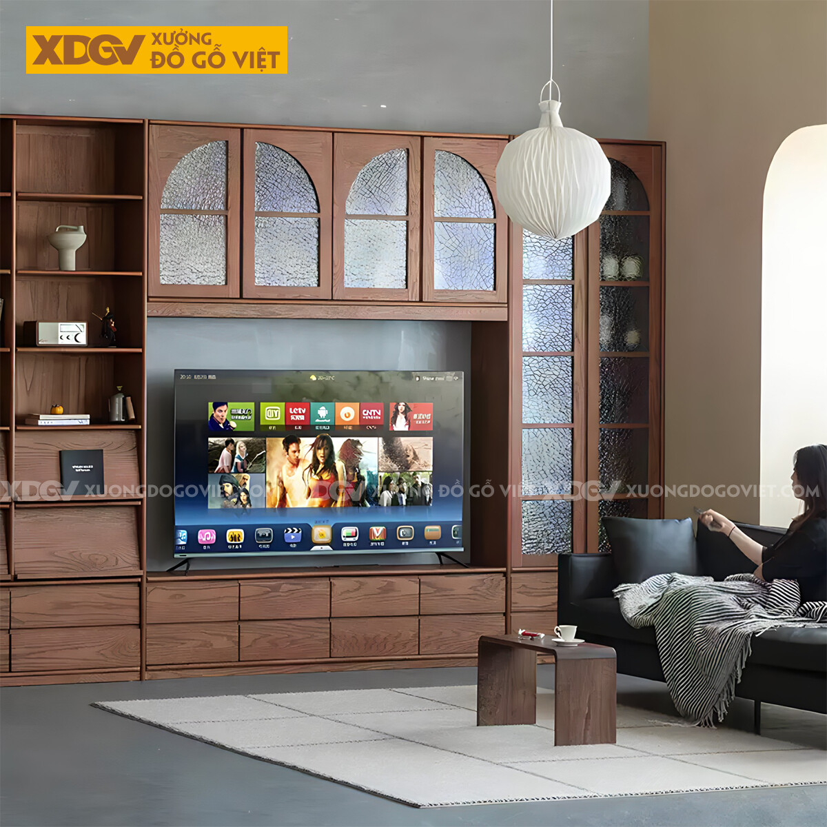 Mẫu Kệ Tivi Mặt Sồi Liền Tủ Cánh Kính Đầu Mái Vòm Tinh Tế