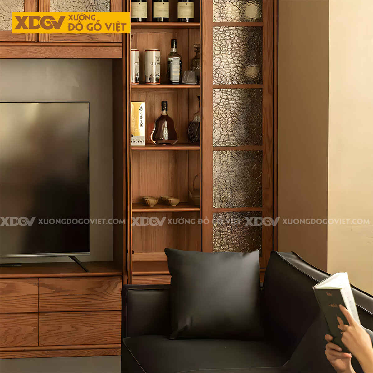 Kệ Tivi Sồi Liền Tủ Cánh Kính Tích Hợp Ngăn Kéo Và Kệ Trên