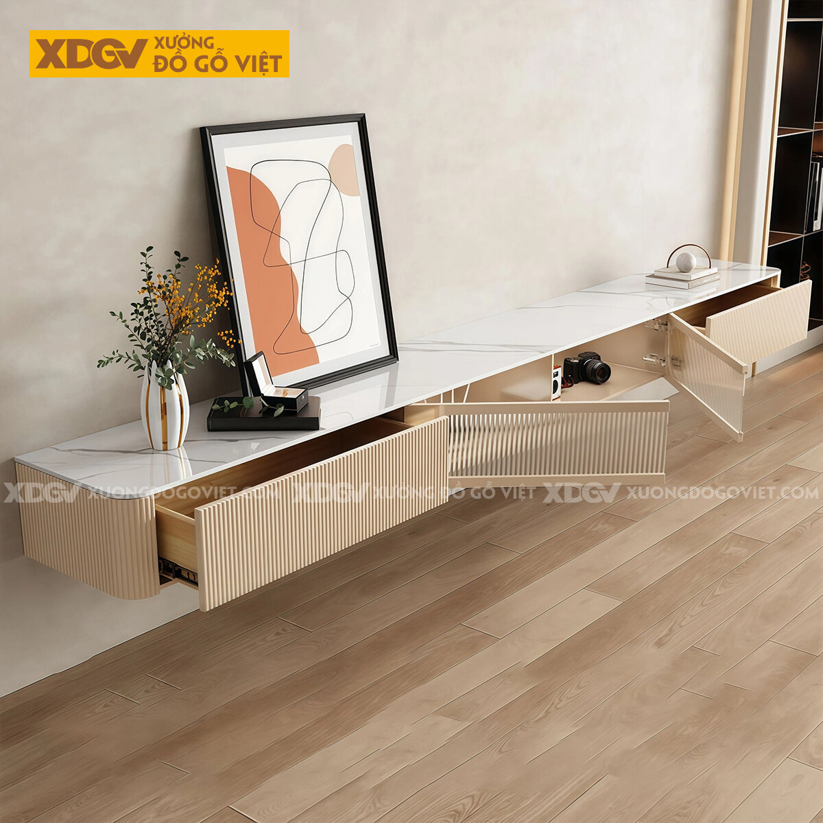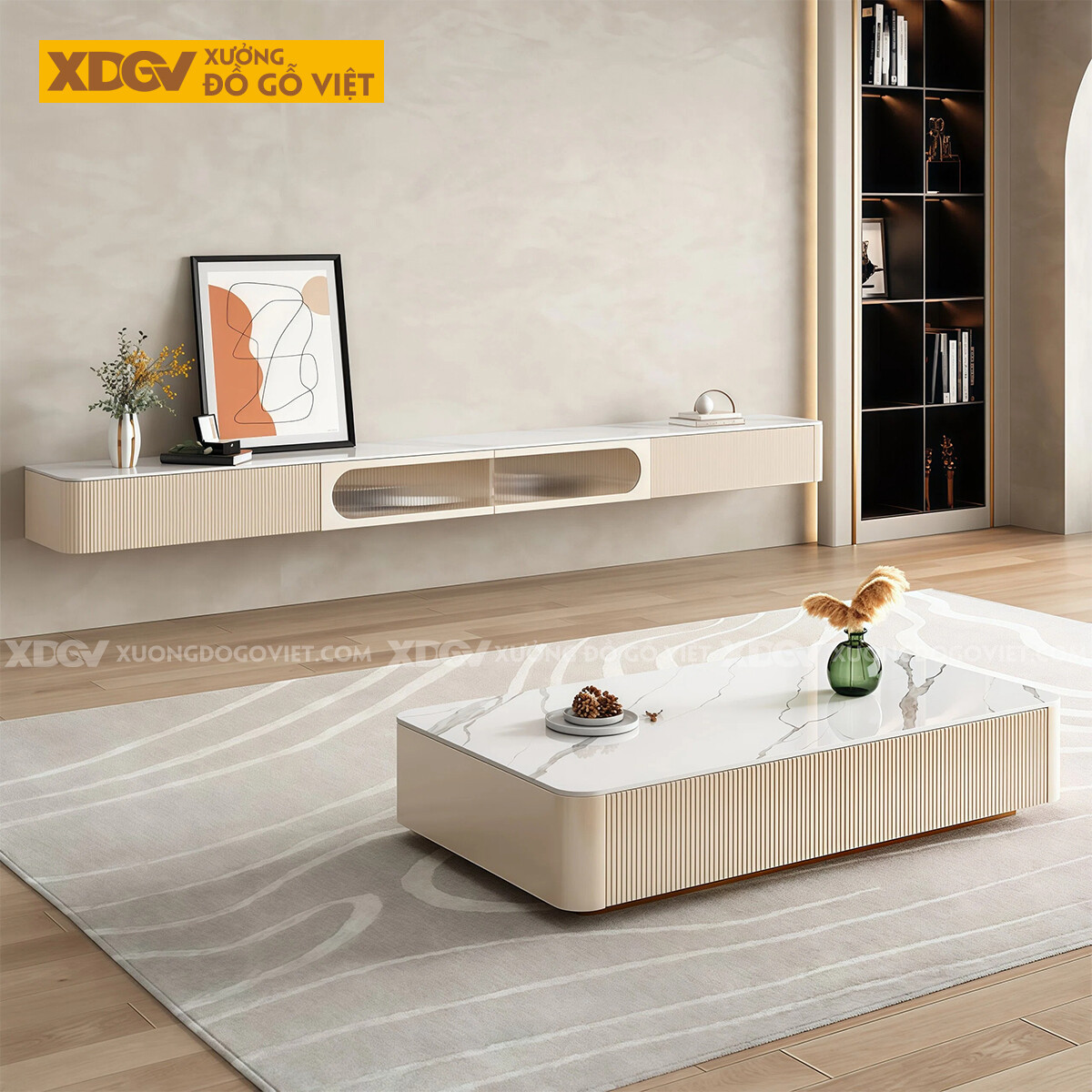 Kệ Để Tivi Trưng Bày Hiện Đại Gỗ Cao Su Mặt Đá Bo Tròn 2 Bên
