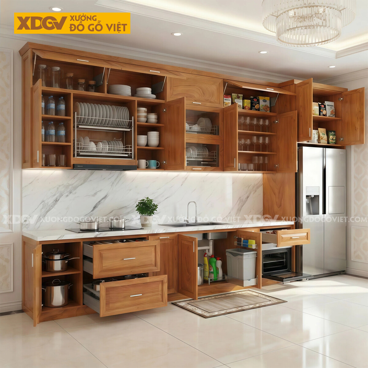 Tủ Bếp Gỗ Gõ Đỏ Vuông Góc Bố Trí Nhiều Ngăn Tủ Siêu Lưu...