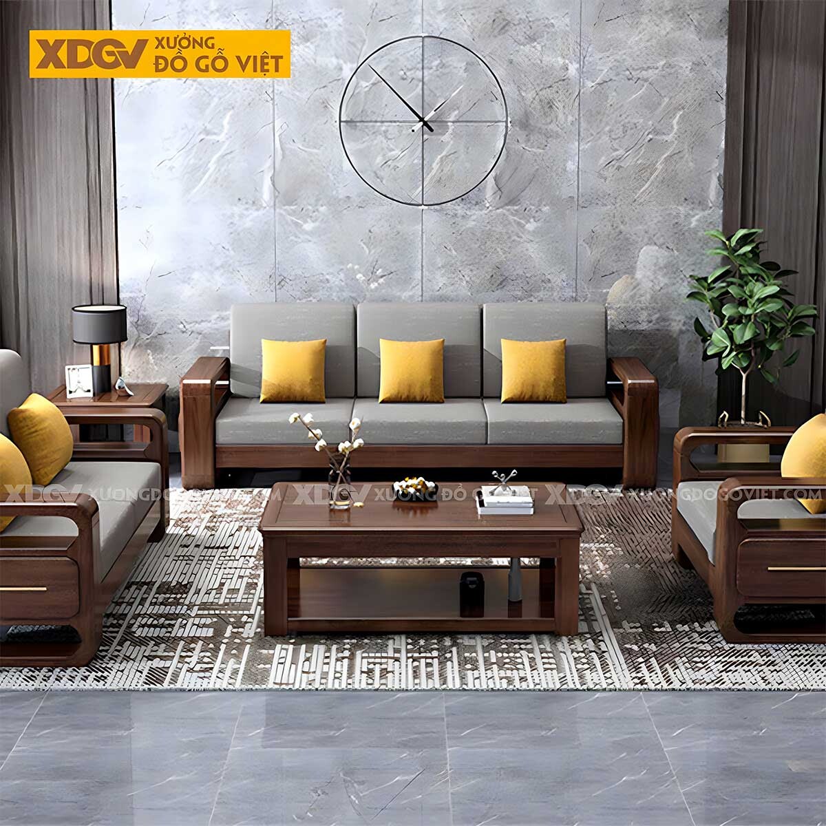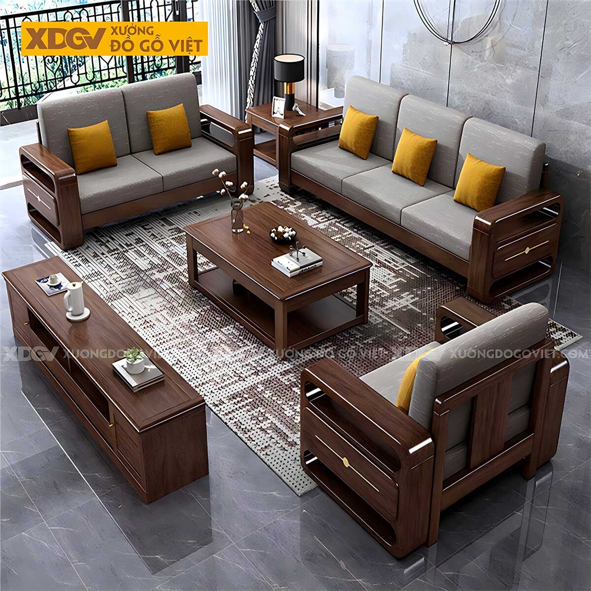 Phần đệm ngồi và tựa lưng được làm rất dày, bọc vải nỉ cao cấp, mang lại cảm giác êm ái và thoải mái tuyệt đối khi ngồi. Màu sắc trung tính (xám, be) của đệm làm nền hoàn hảo cho khung gỗ sẫm màu và những chiếc gối tựa có màu sắc nổi bật.