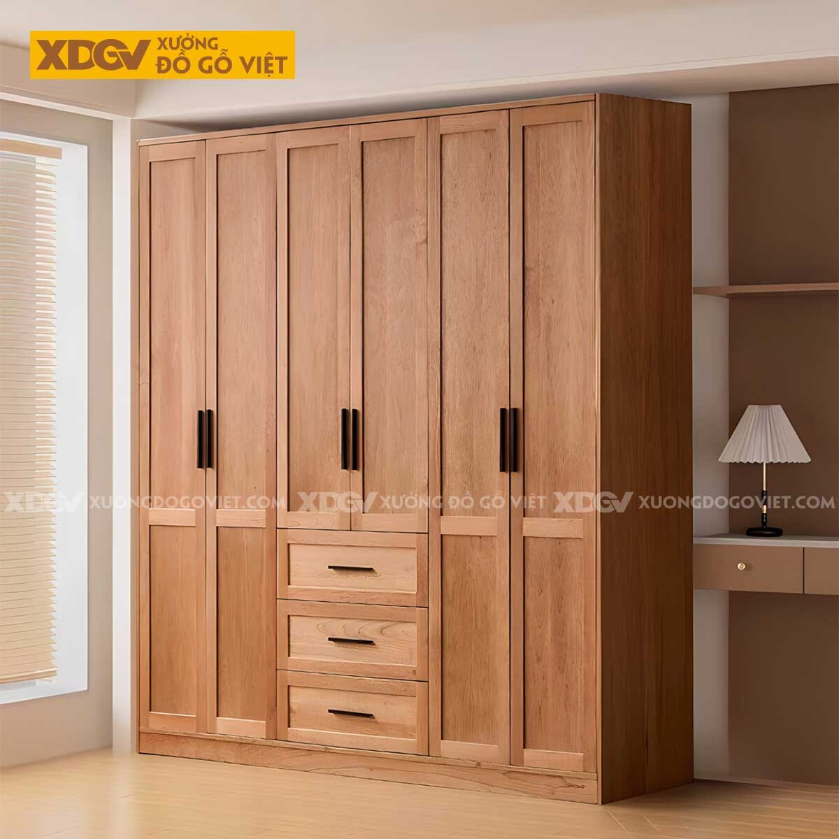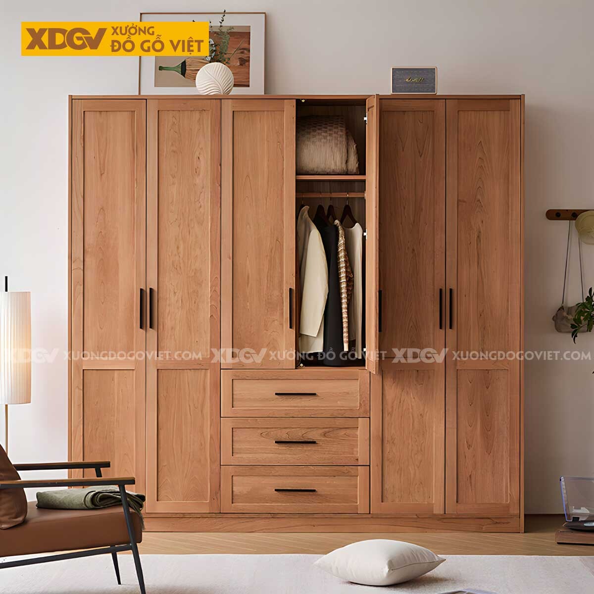 Tủ Quần Áo Gỗ Sồi Kịch Trần 6 Buồng Không Gian Lưu Trữ Lớn