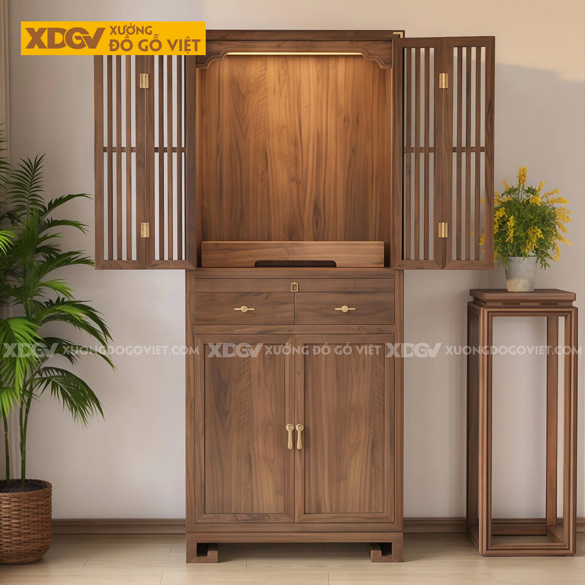 Tủ Thờ Phòng Thờ Gỗ Óc Chó Chân Cuộn Cánh Nan Phối Ngăn Kéo
