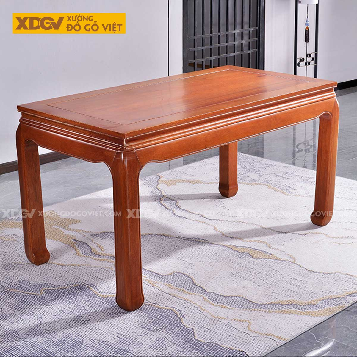 Mặt bàn dày dặn: Mặt bàn được làm từ những tấm gỗ gõ đỏ nguyên khối, dày dặn và rộng rãi, nổi bật với đường vân gỗ tự nhiên tuyệt đẹp.