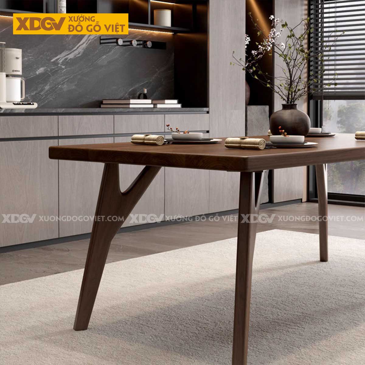 Bàn ăn gỗ Óc Chó nhập khẩu chính ngạch từ Mỹ, sản xuất tại Xưởng Đồ Gỗ Việt. Sự thành công của thiết kế chiết trung này nằm ở việc sử dụng vật liệu một cách thông minh để tạo ra sự kết nối.