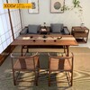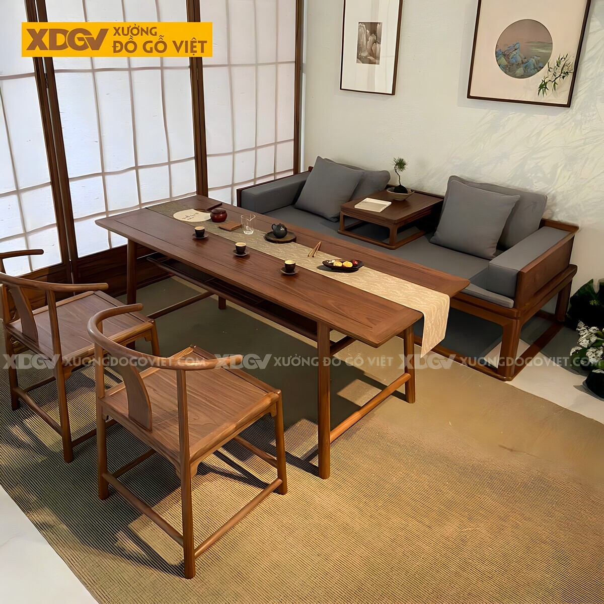 Bàn trà dài: Chiếc bàn đóng vai trò là trung tâm, là "sân khấu" cho nghi thức thưởng trà. Bàn có dáng dài, thấp và hẹp, với mặt bàn lớn để lộ toàn bộ vẻ đẹp của vân gỗ. Kiểu dáng đơn giản nhưng tỷ lệ hoàn hảo của nó tạo nên một vẻ đẹp trang trọng và tĩnh tại.