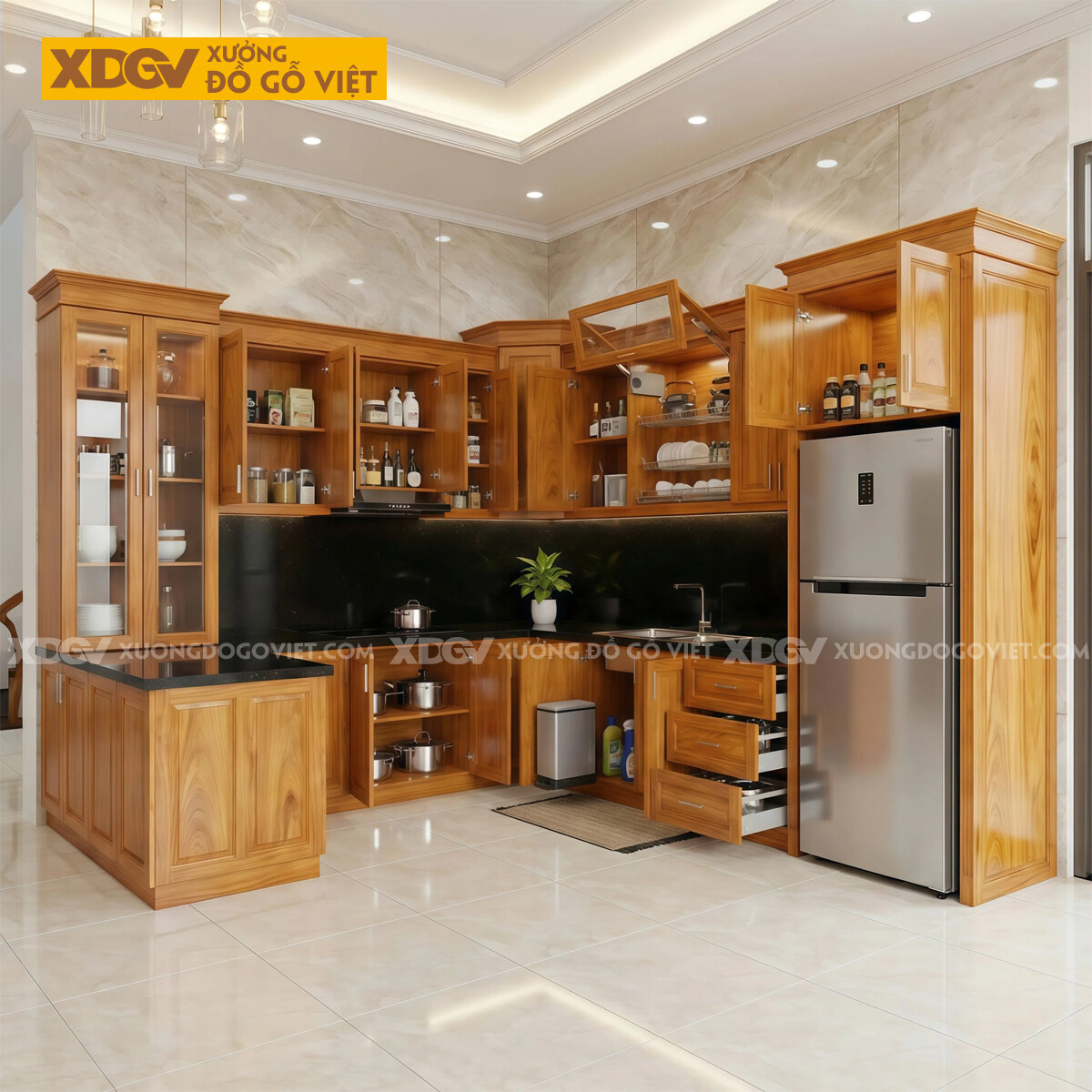 Tủ Bếp Gỗ Gõ Đỏ Vuông Góc Bố Trí Nhiều Ngăn Tủ Siêu Lưu...