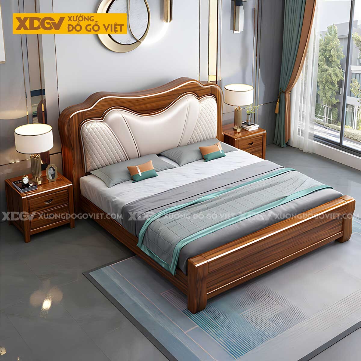 Giường Ngủ Gỗ Lim Đầu Bọc Nệm Chỉ Nổi Đối Xứng Sang...