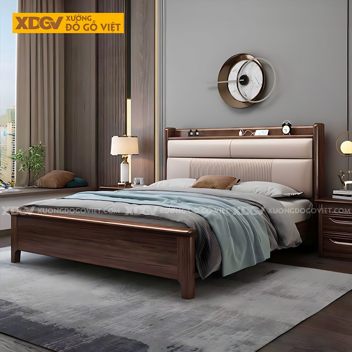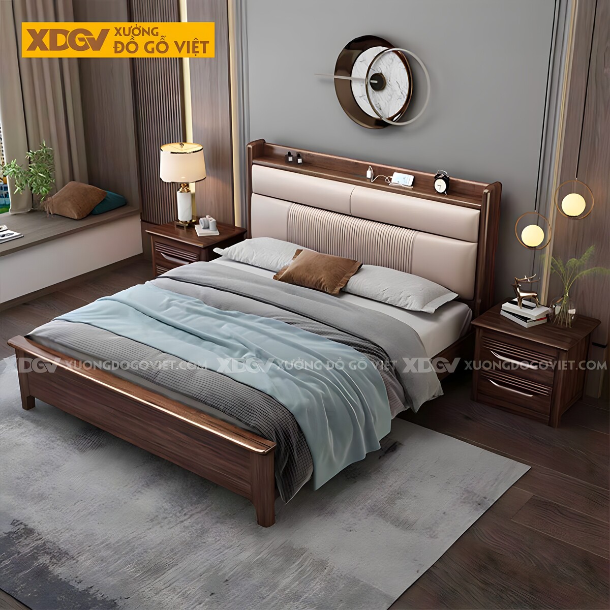 Giường Ngủ Gỗ Óc Chó Đầu Bọc Nệm Kẻ Chỉ Kèm Kệ Trang Trí