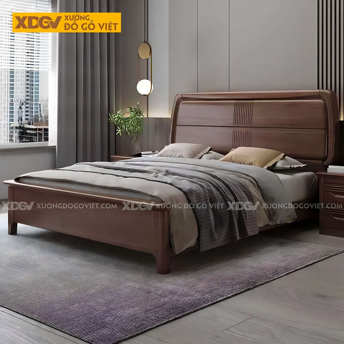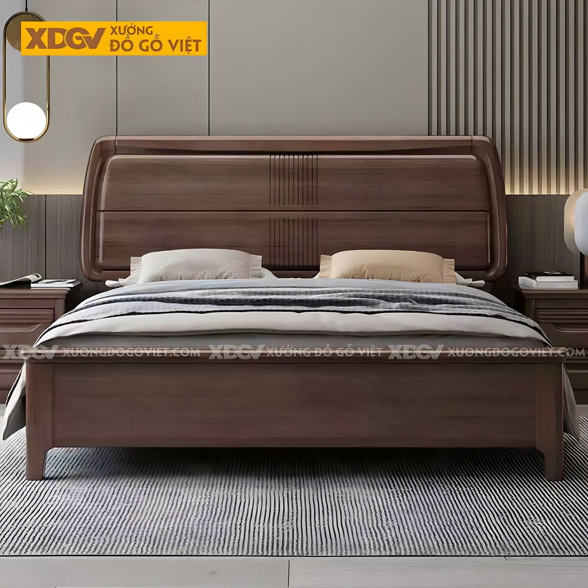 Giường Ngủ Gỗ Óc Chó Đầu Panel Ngang Sọc Dọc Giữa Đối Xứng