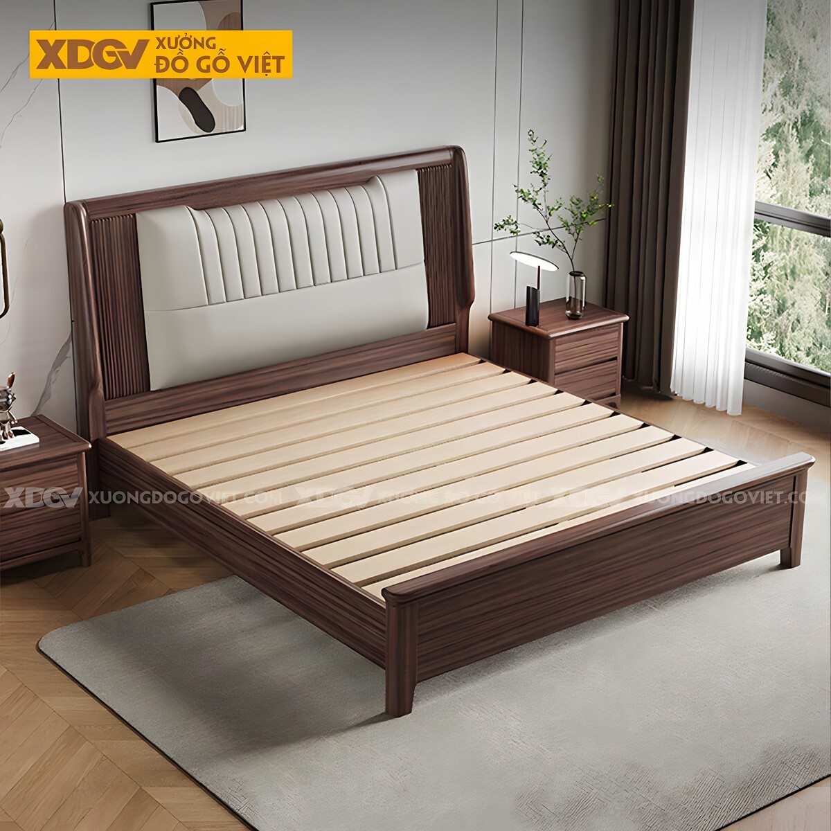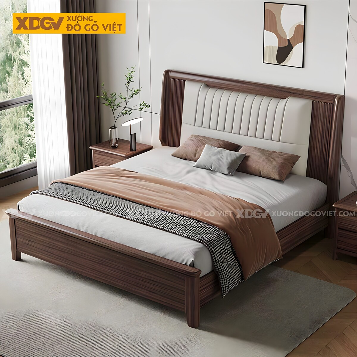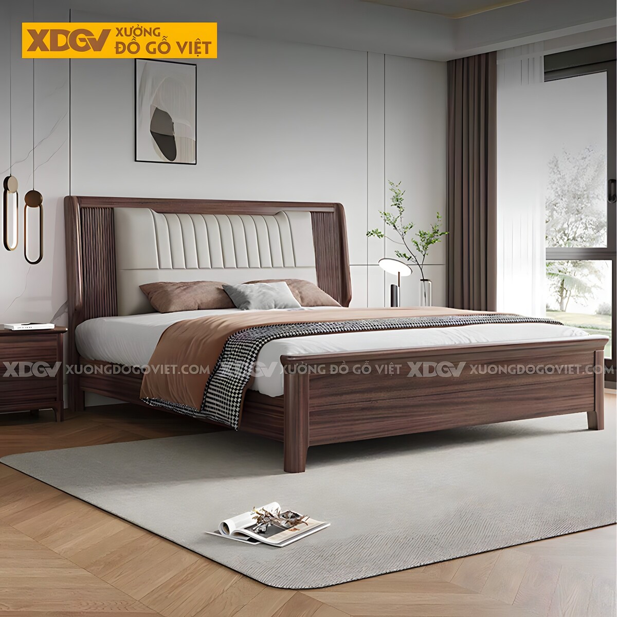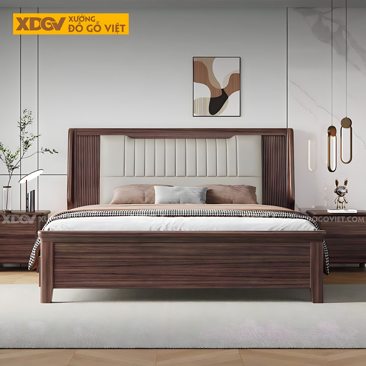 Giường Ngủ Gỗ Óc Chó Hiện Đại Đầu Bọc Đệm Múi Dọc Đối Xứng
