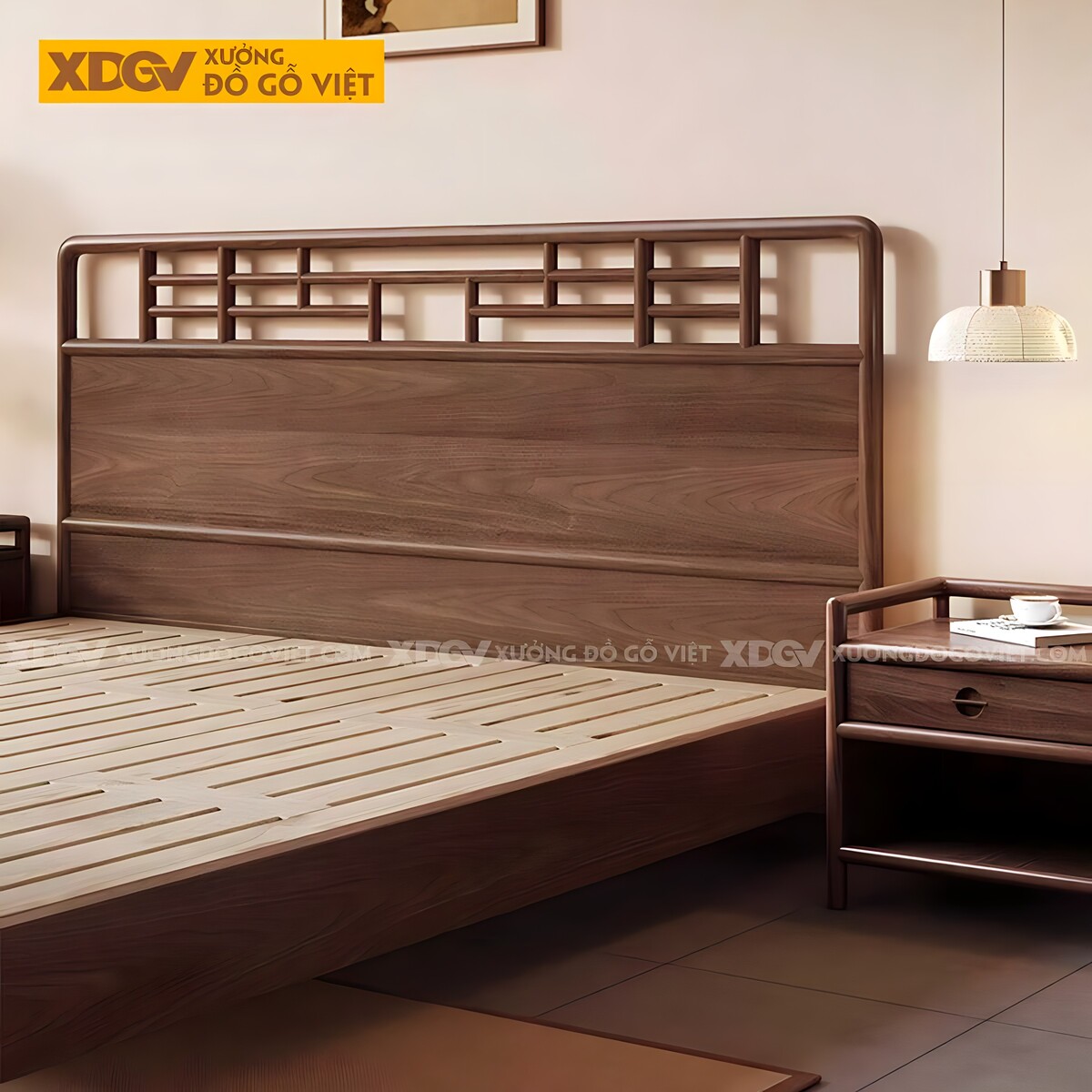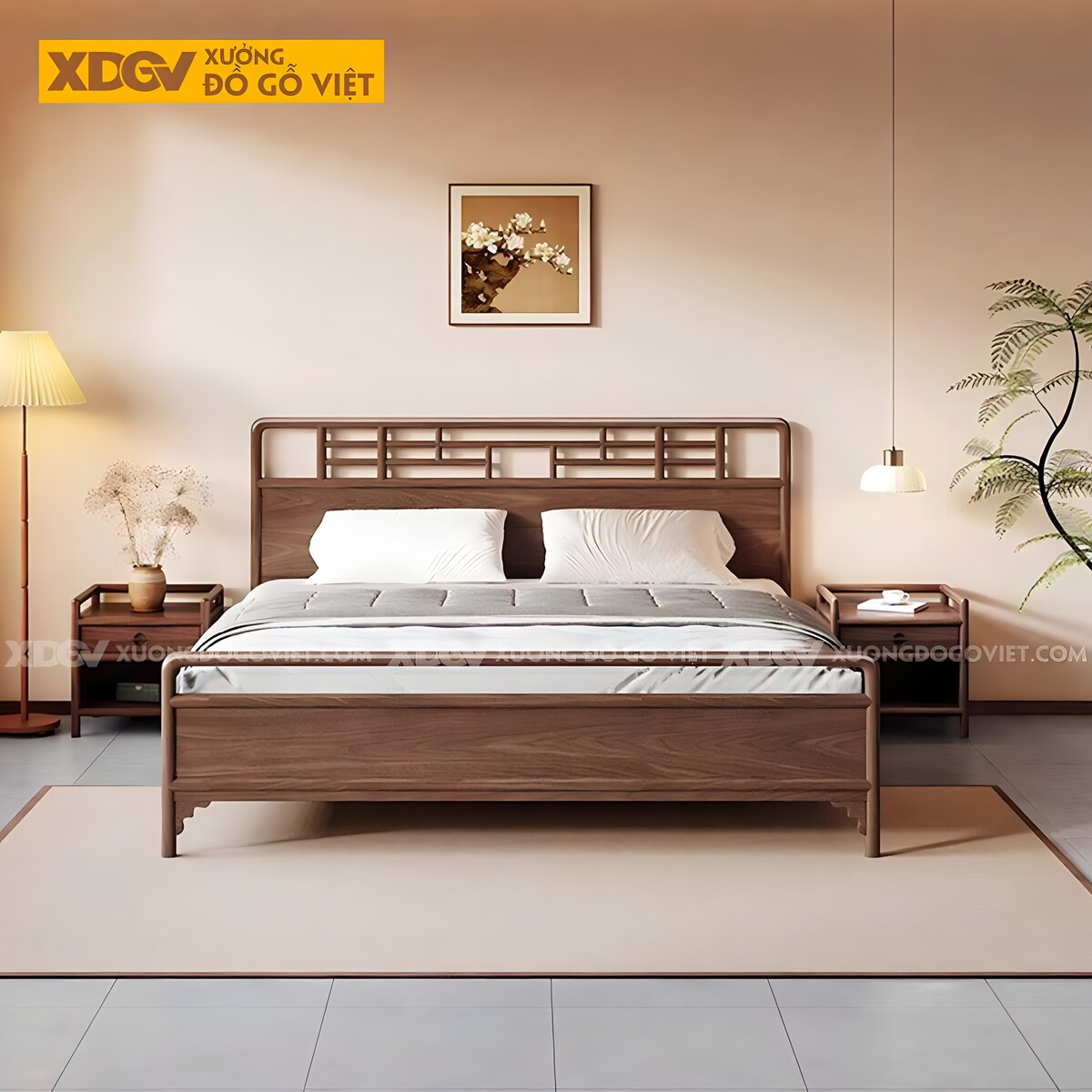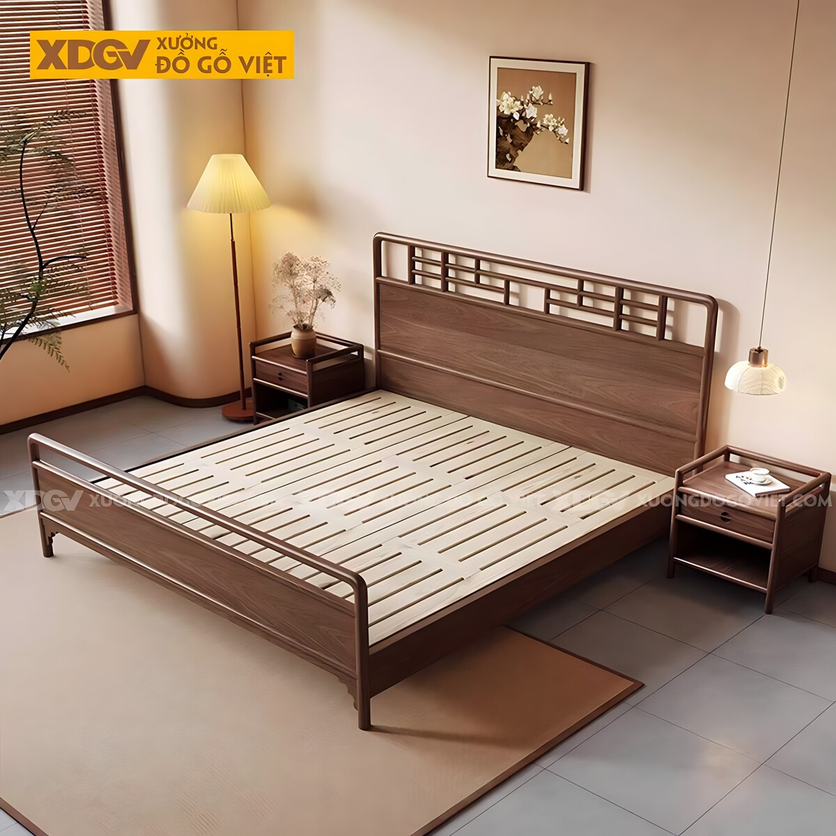 Giường Ngủ Gỗ Óc Chó Japandi Á Đông Họa Tiết Song Cửa