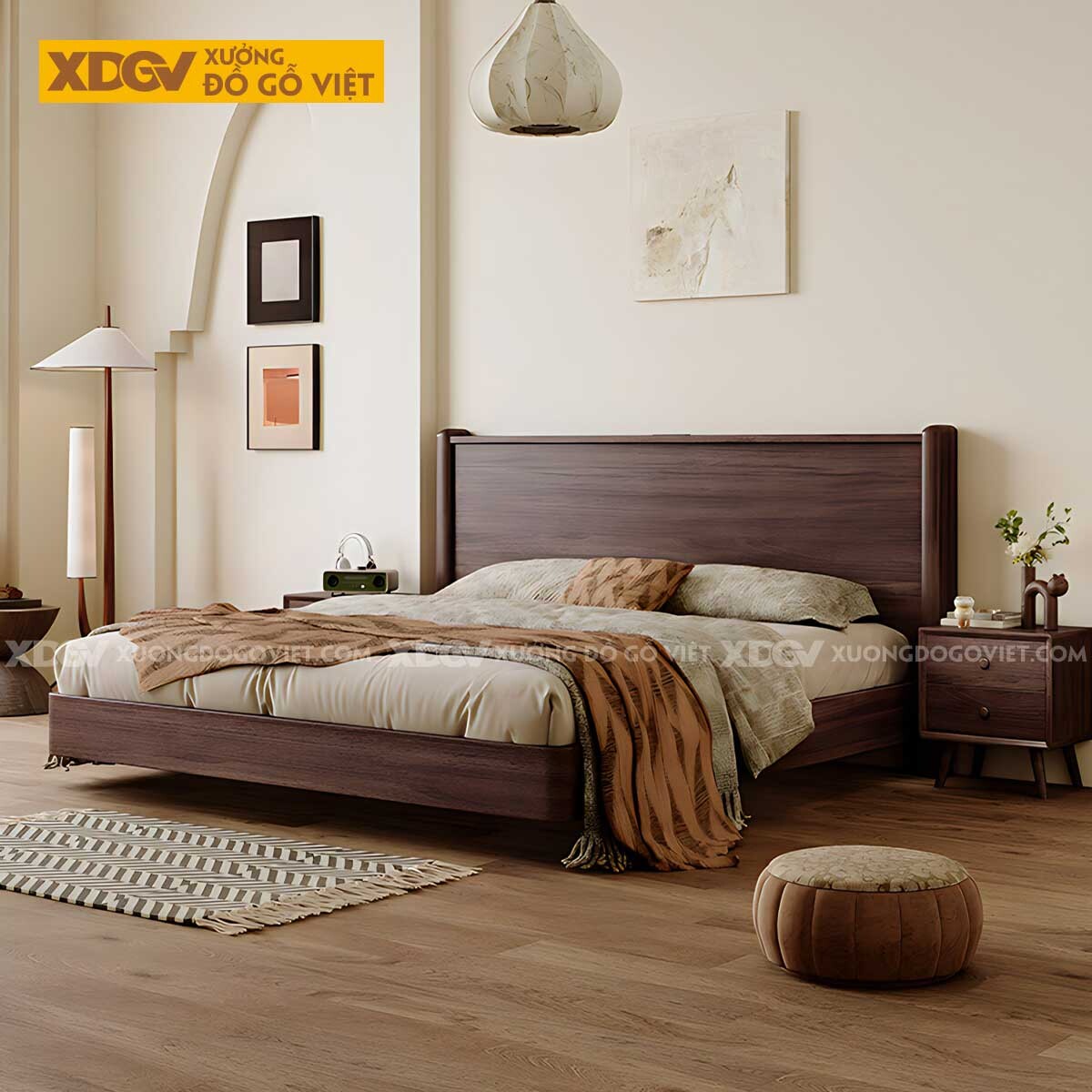 Giường Ngủ Gỗ Veneer Óc Chó Chân Trụ Tròn Khuất Lùi Độc Đáo