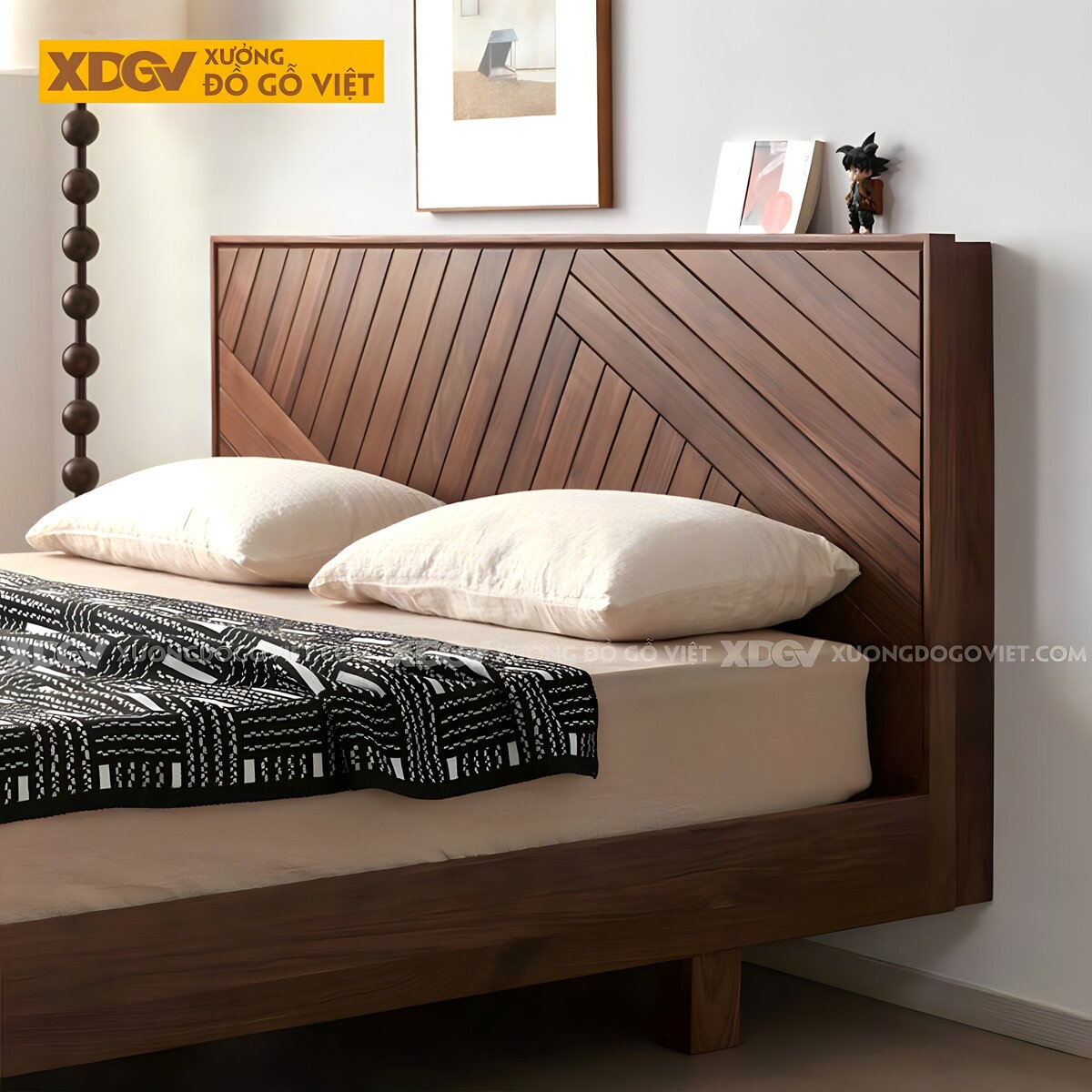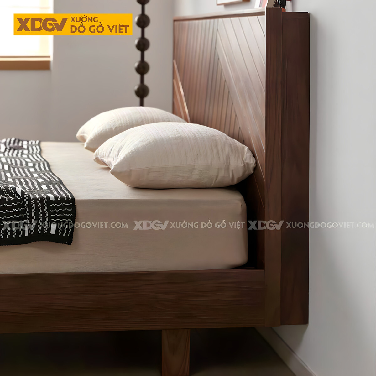 Giường Ngủ Gỗ Óc Chó Đầu Bọc Nệm Kẻ Chỉ Kèm Kệ Trang Trí