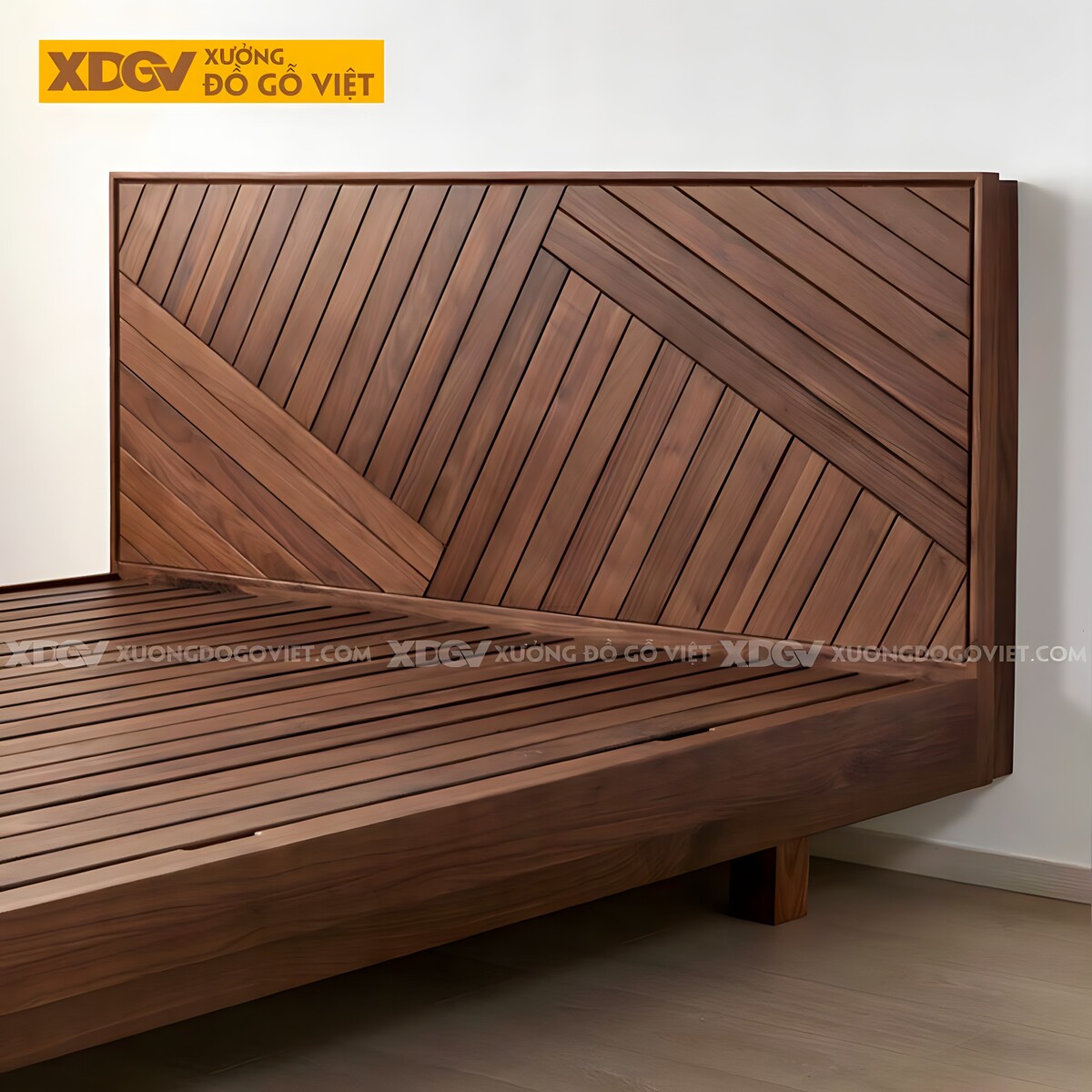 Giường Ngủ Óc Chó Dạng Hộp Giấu Chân Đầu Ghép Gỗ Đan Xen