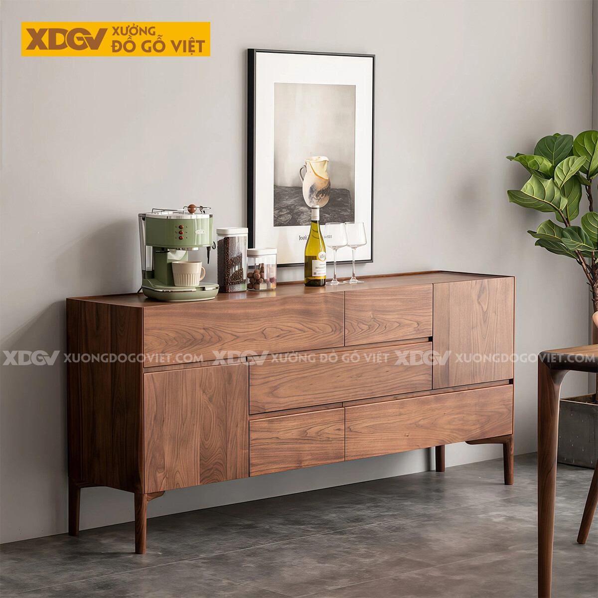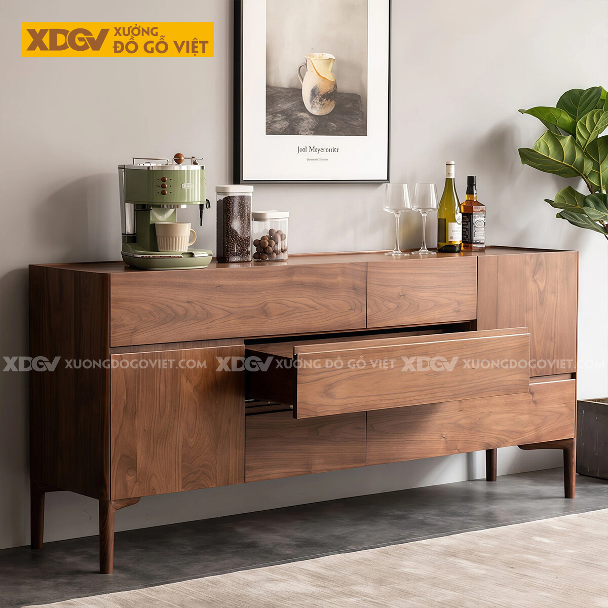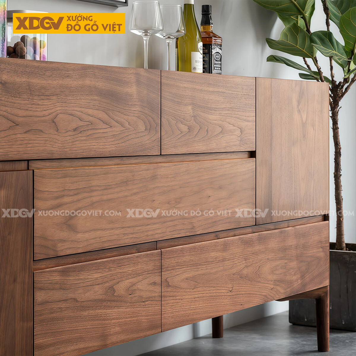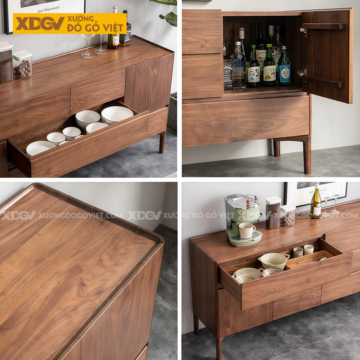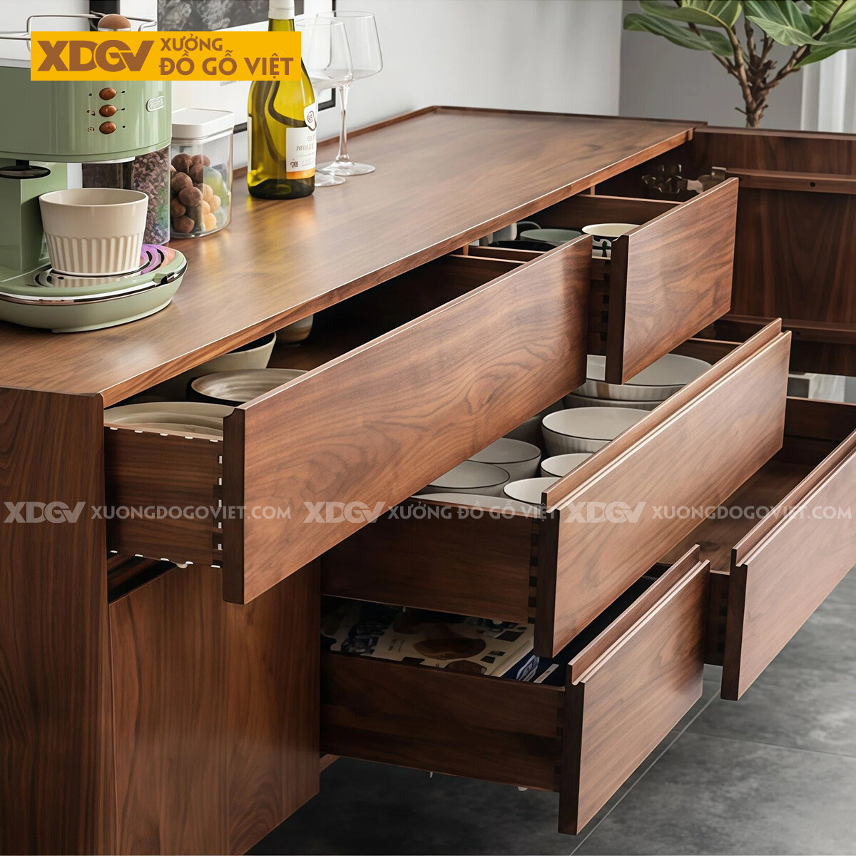 Kiểu Tủ Đựng Chén Bát Gỗ Óc Chó Bố Cục Chia Ngăn Kéo Lạ Mắt