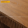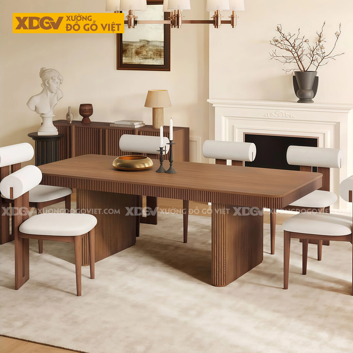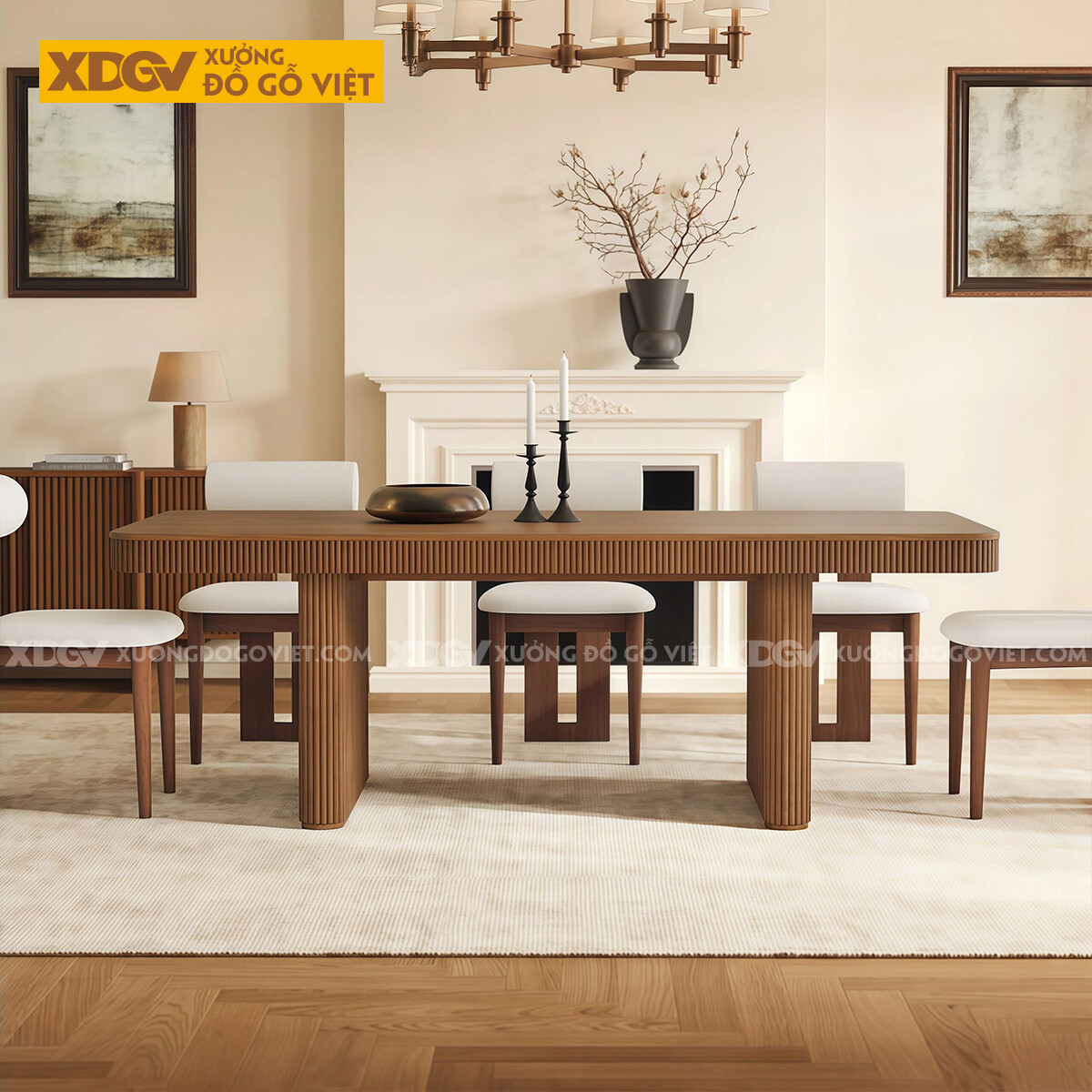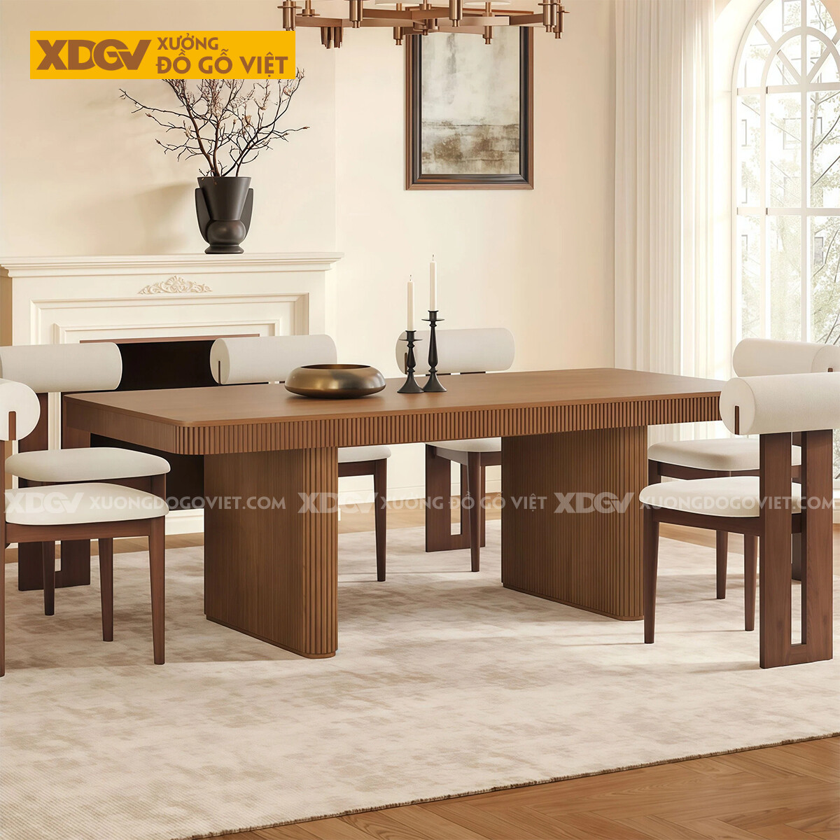 Mẫu Bàn Ăn Sồi Chân Trụ Vuông Bo Cạnh Ốp Chỉ Dọc Nghệ Thuật