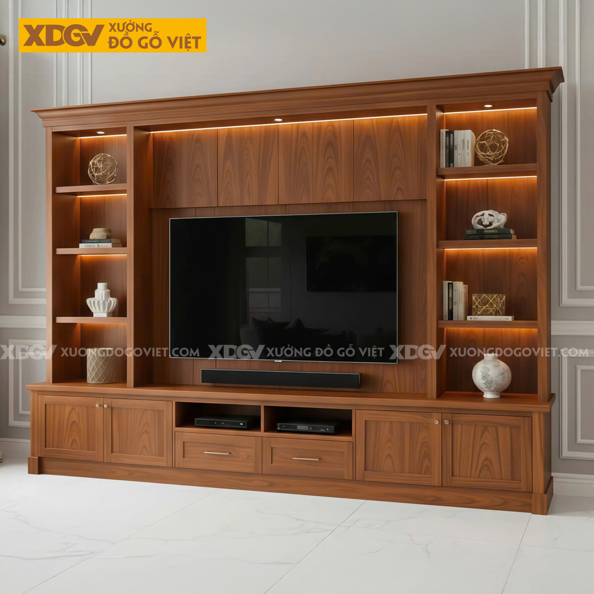 Mẫu Kệ Tivi Kèm Tủ Phòng Khách Gỗ Gõ Đỏ Phối Kệ Mở Đèn Led