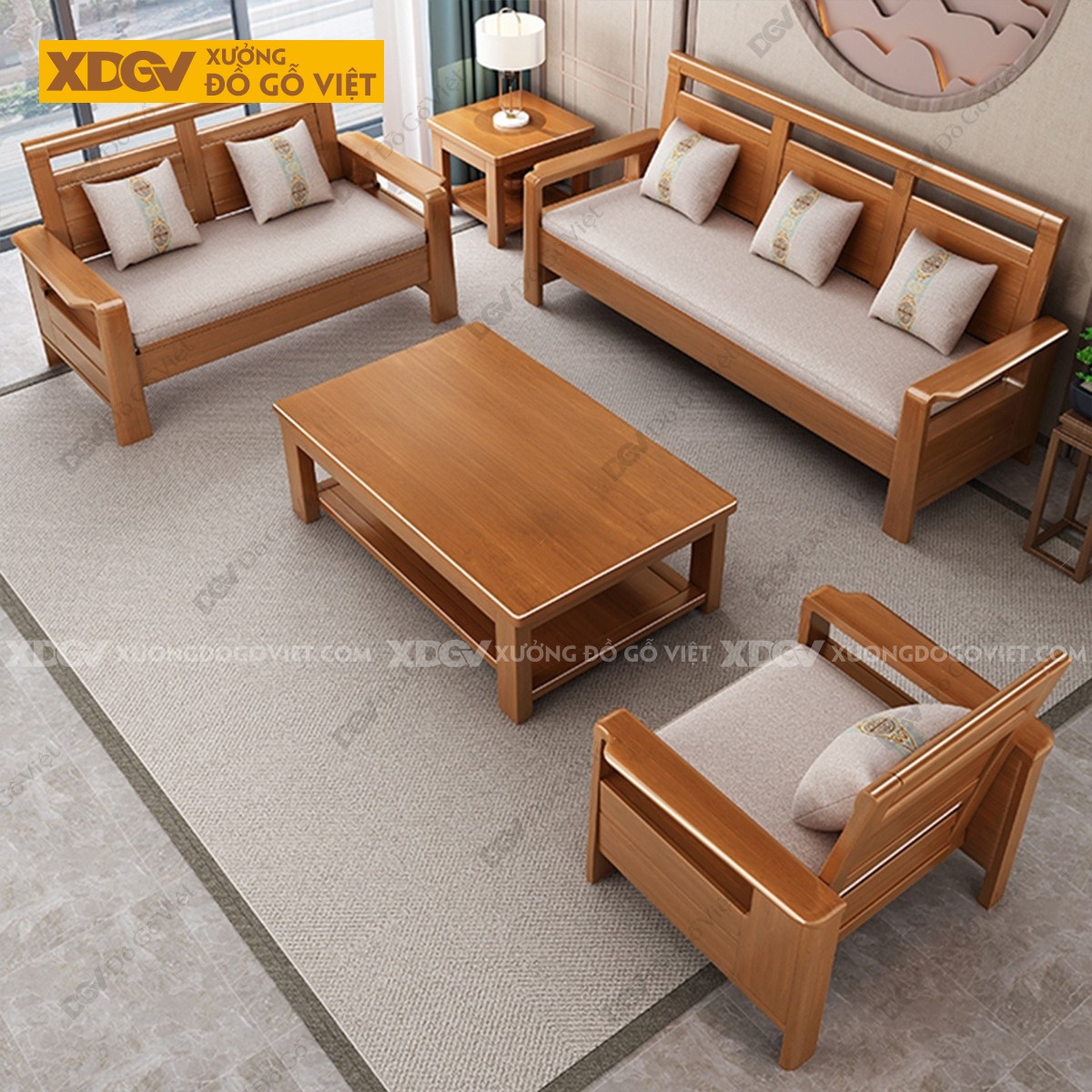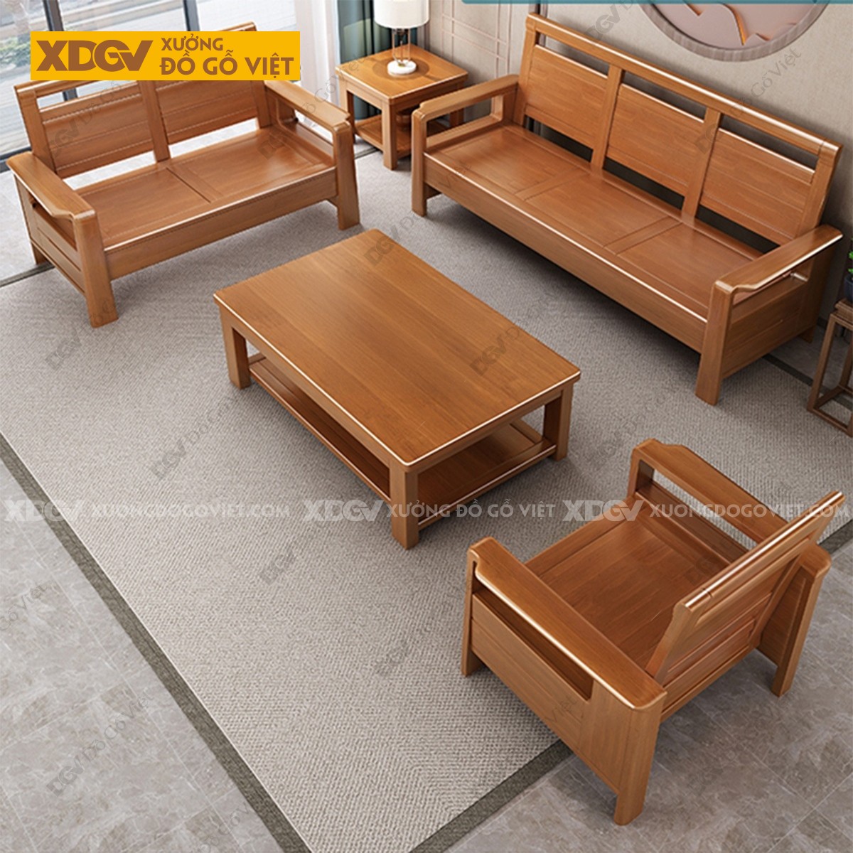 Kích thước bài trí nguyên bộ: Dài 330cm x Rộng 220cm x Cao 89cm (Tay 12cm, gỗ dày 4-5cm).