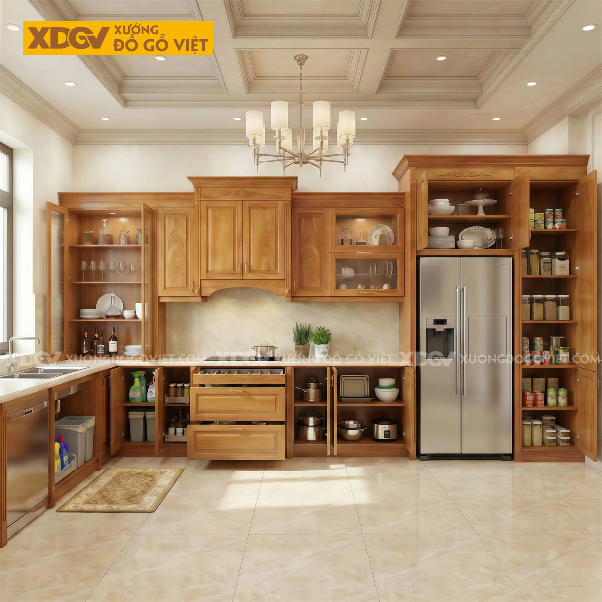 Tủ Bếp Gỗ Gõ Đỏ Vuông Góc Bố Trí Nhiều Ngăn Tủ Siêu Lưu...