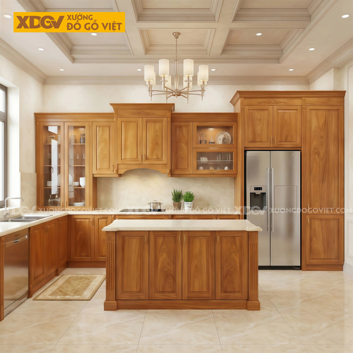 Bộ Tủ Bếp Gỗ Gõ Đỏ Góc L Kèm Tủ Kính Phân Tầng Sang Trọng