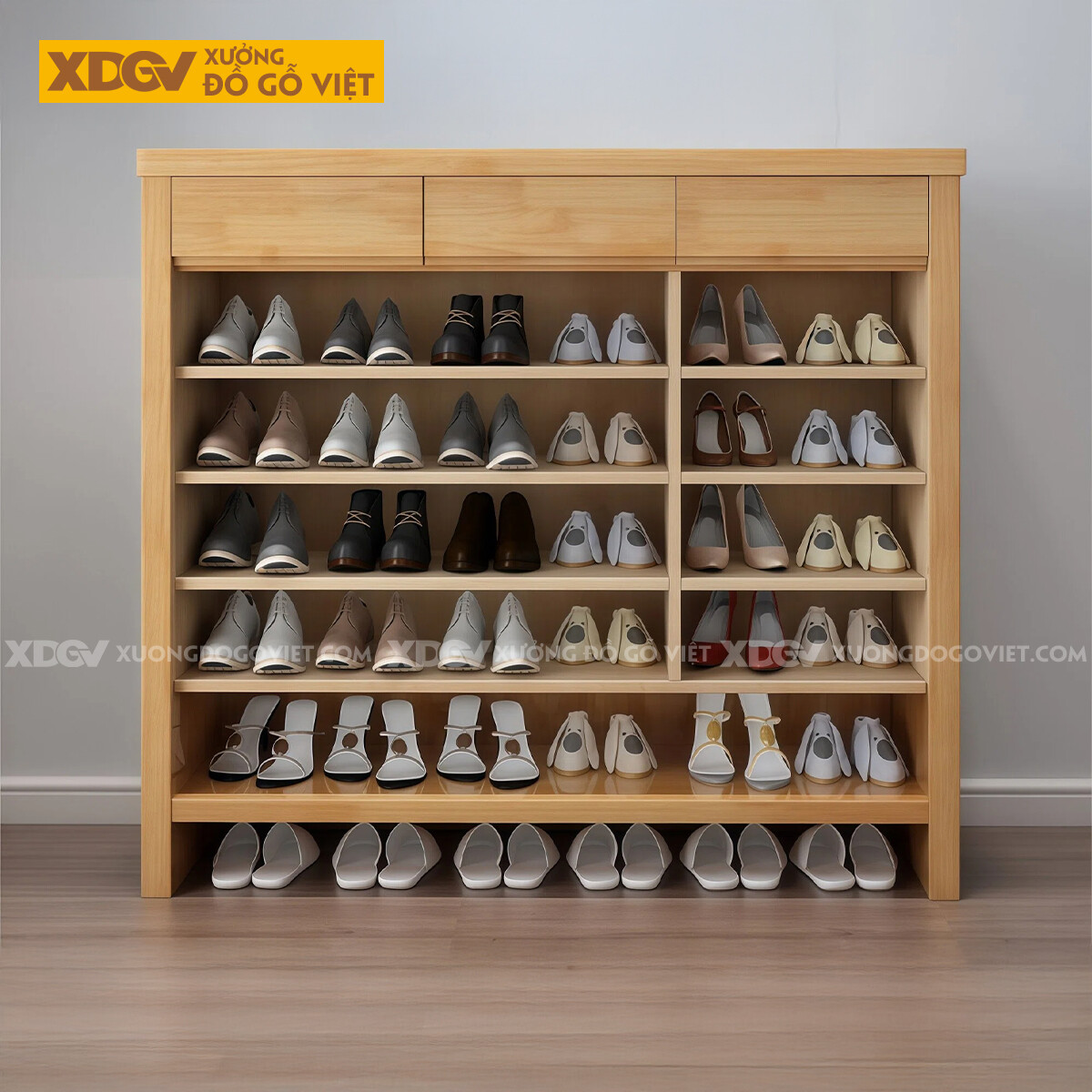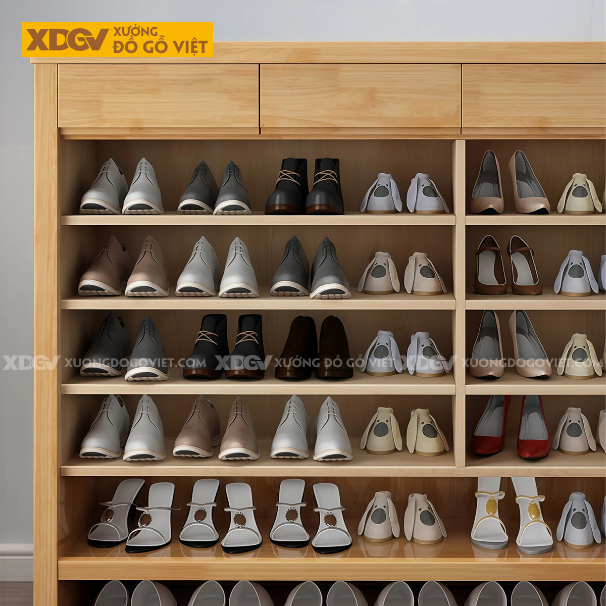Mẫu Tủ Kệ Để Giày Gỗ Cao Su Cánh Phối Pano Bố Cục Linh Hoạt