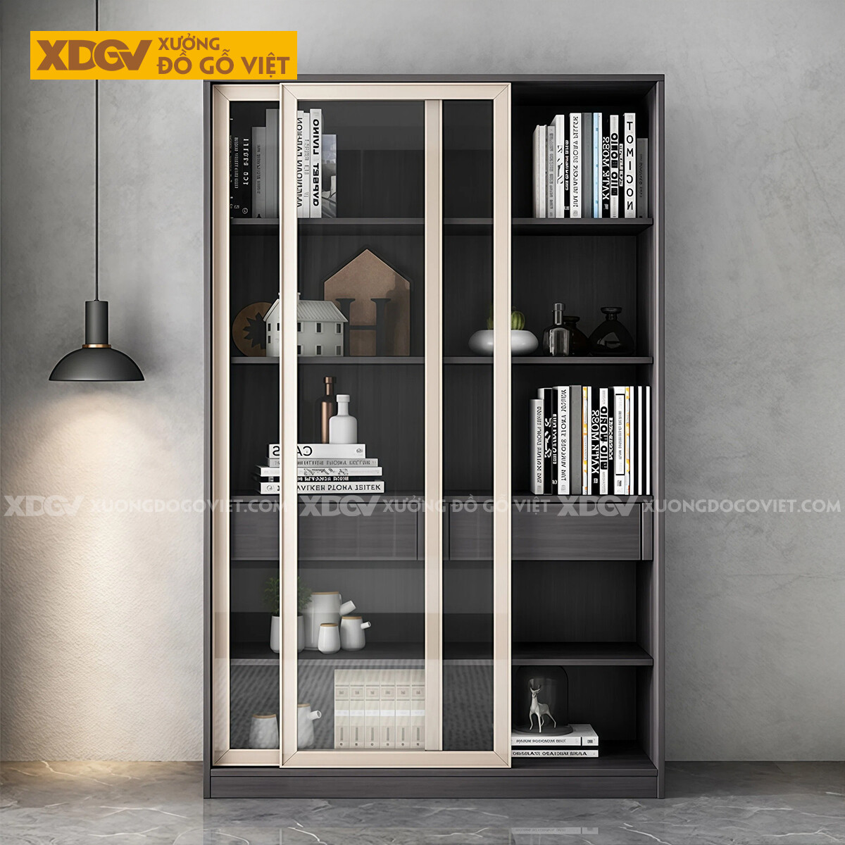 Tủ Sách Lưu Trữ Gỗ MDF Phối Hợp Giữa Cánh Kính Và Ngăn Kéo