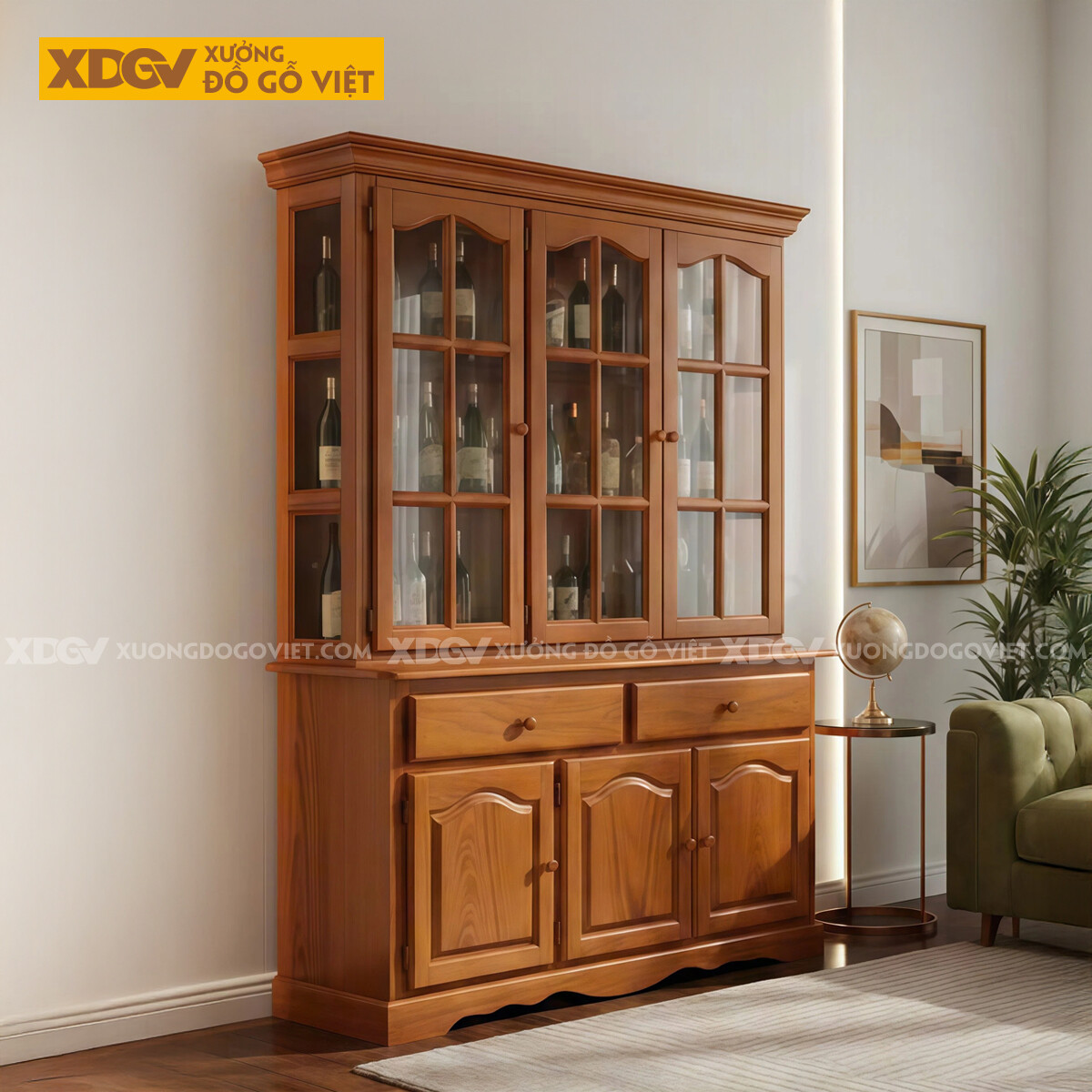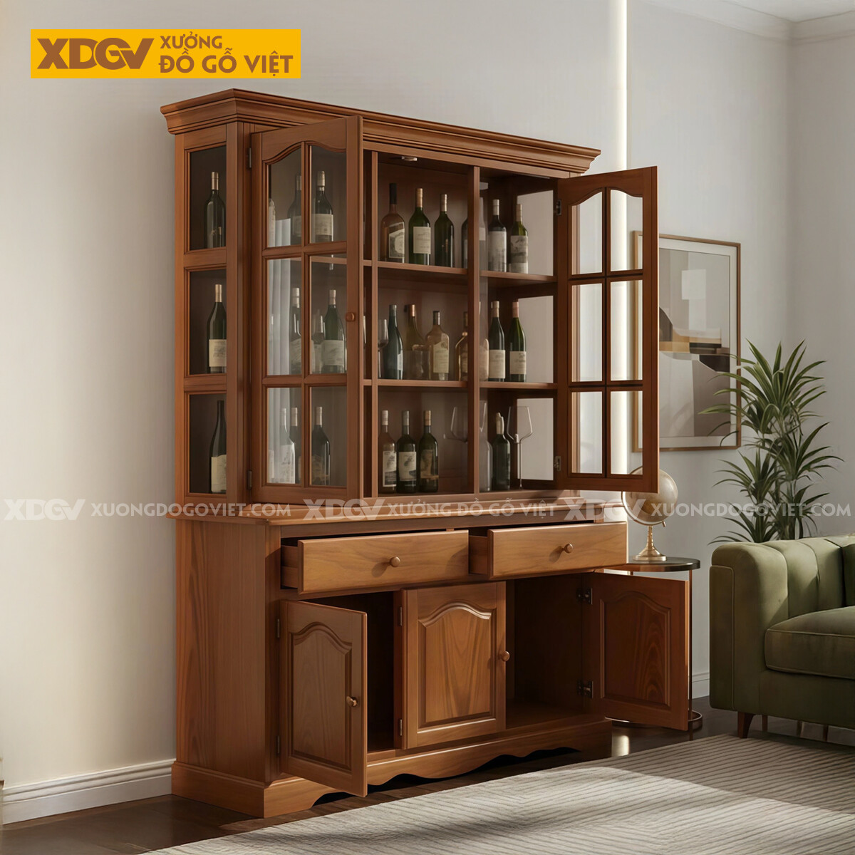 Mẫu Tủ Rượu Gỗ Gõ Đỏ Tân Cổ Điển Chân Bệ Cánh Kính Chia Ô
