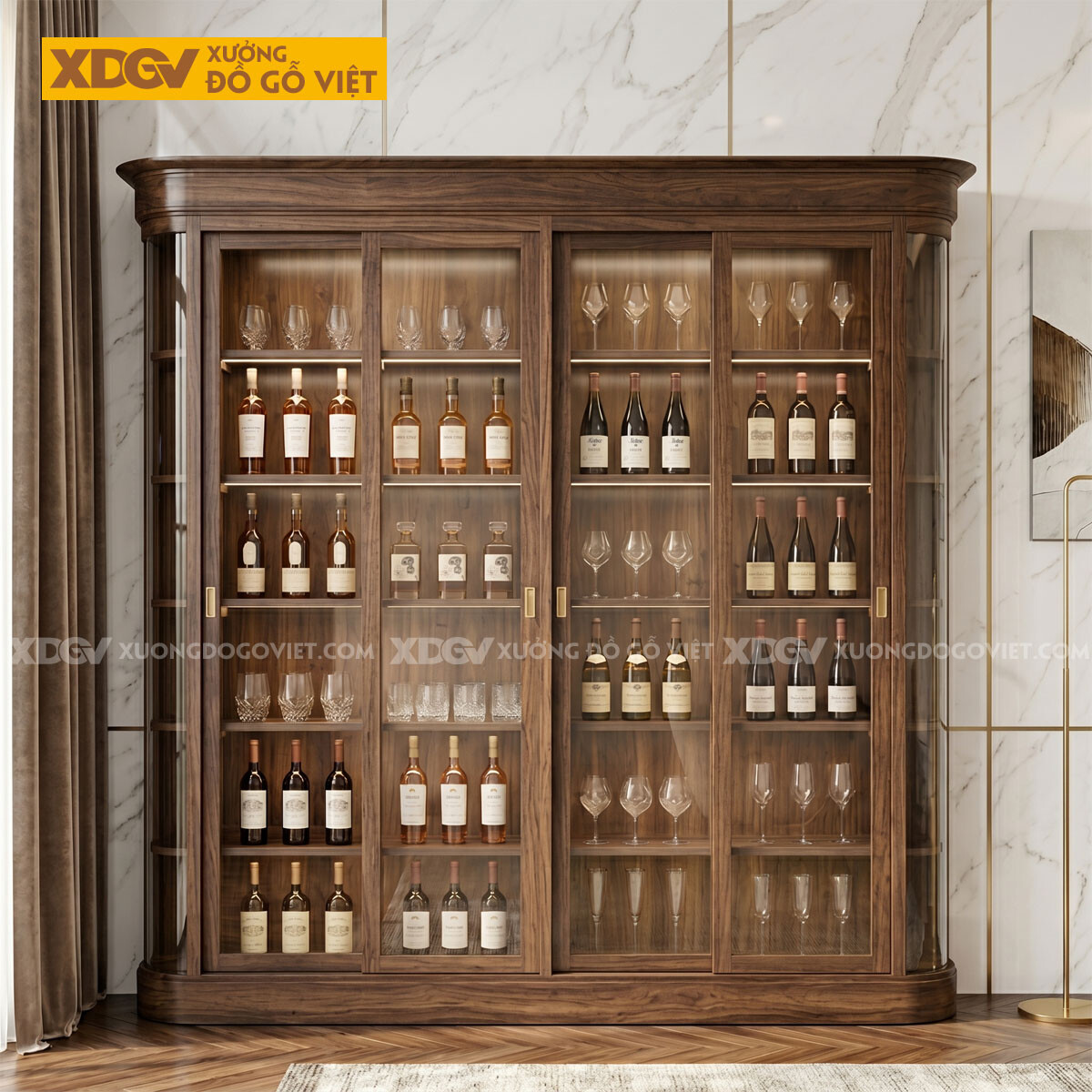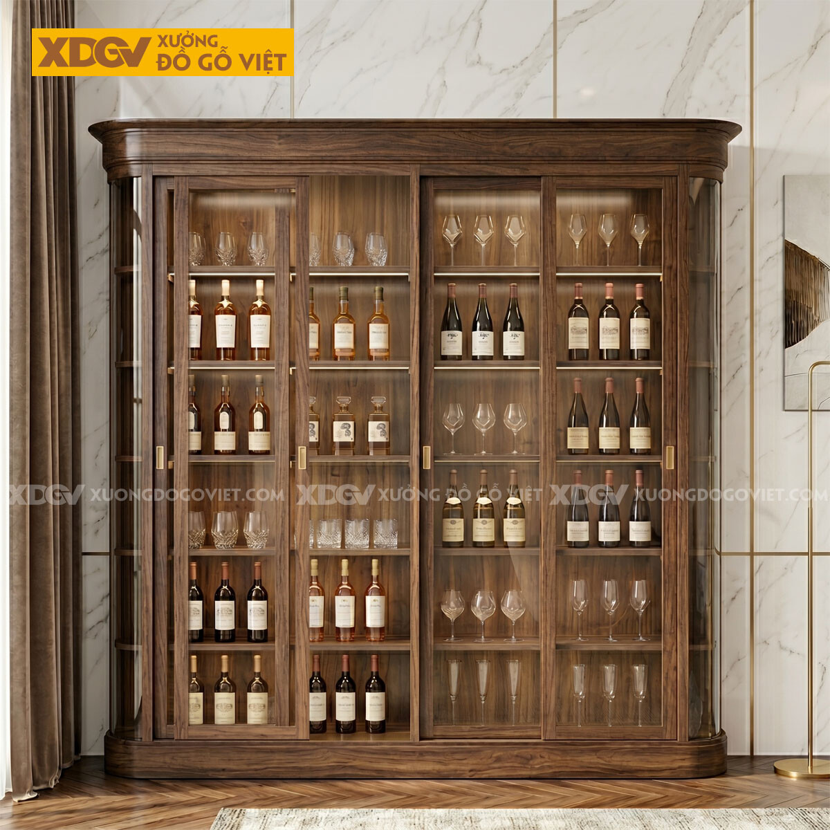 Mẫu Tủ Rượu Gỗ Óc Chó Bo Góc Cửa Lùa Phối Kính Sang Trọng