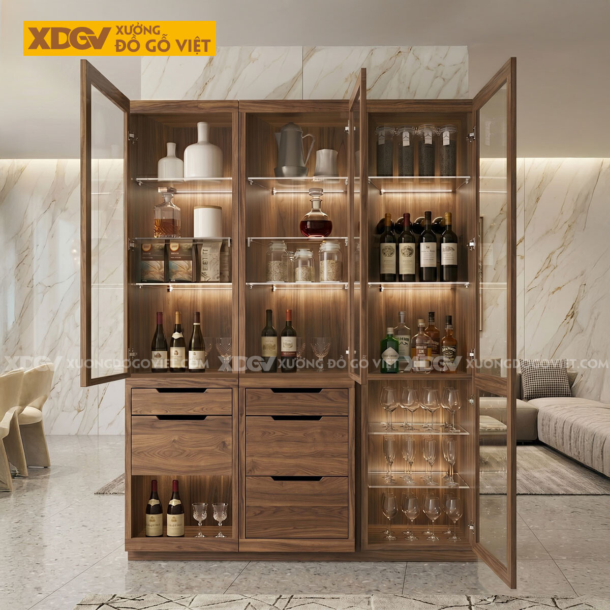 Mẫu Tủ Rượu Hiện Đại Gỗ Óc Chó Kết Hợp Tủ Kính Kèm Ngăn Kéo