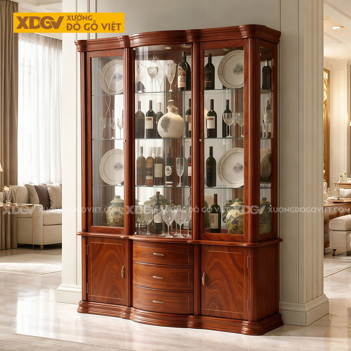 Mẫu Tủ Rượu Gỗ Gõ Đỏ Tân Cổ Điển Chân Bệ Cánh Kính Chia...