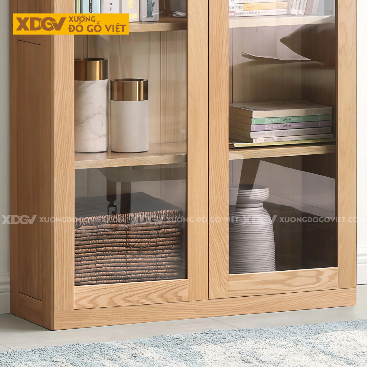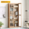Mẫu Tủ Sách Tối Giản Gỗ Sồi Mỹ Chân Bệt Phối Kính Sang Trọng