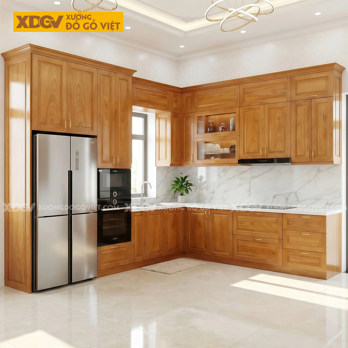 Mẫu Tủ Bếp Gỗ Gõ Đỏ Chữ L Bố Trí Thông Minh Phối Cánh Kính
