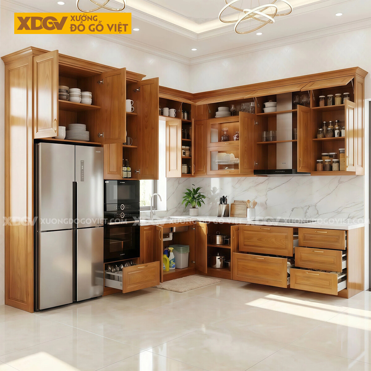 Tủ Bếp Gỗ Gõ Đỏ Vuông Góc Bố Trí Nhiều Ngăn Tủ Siêu Lưu Trữ