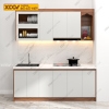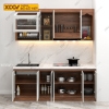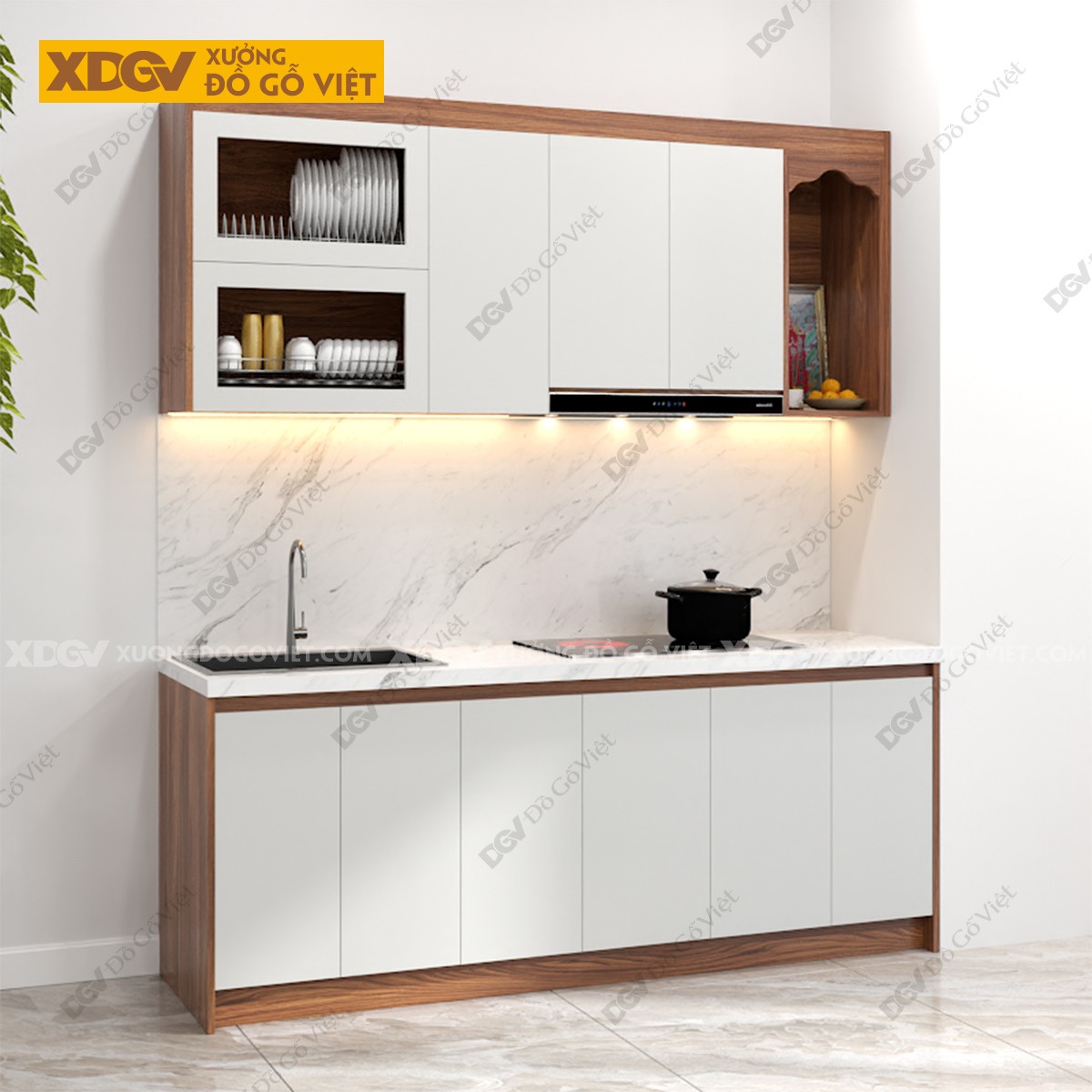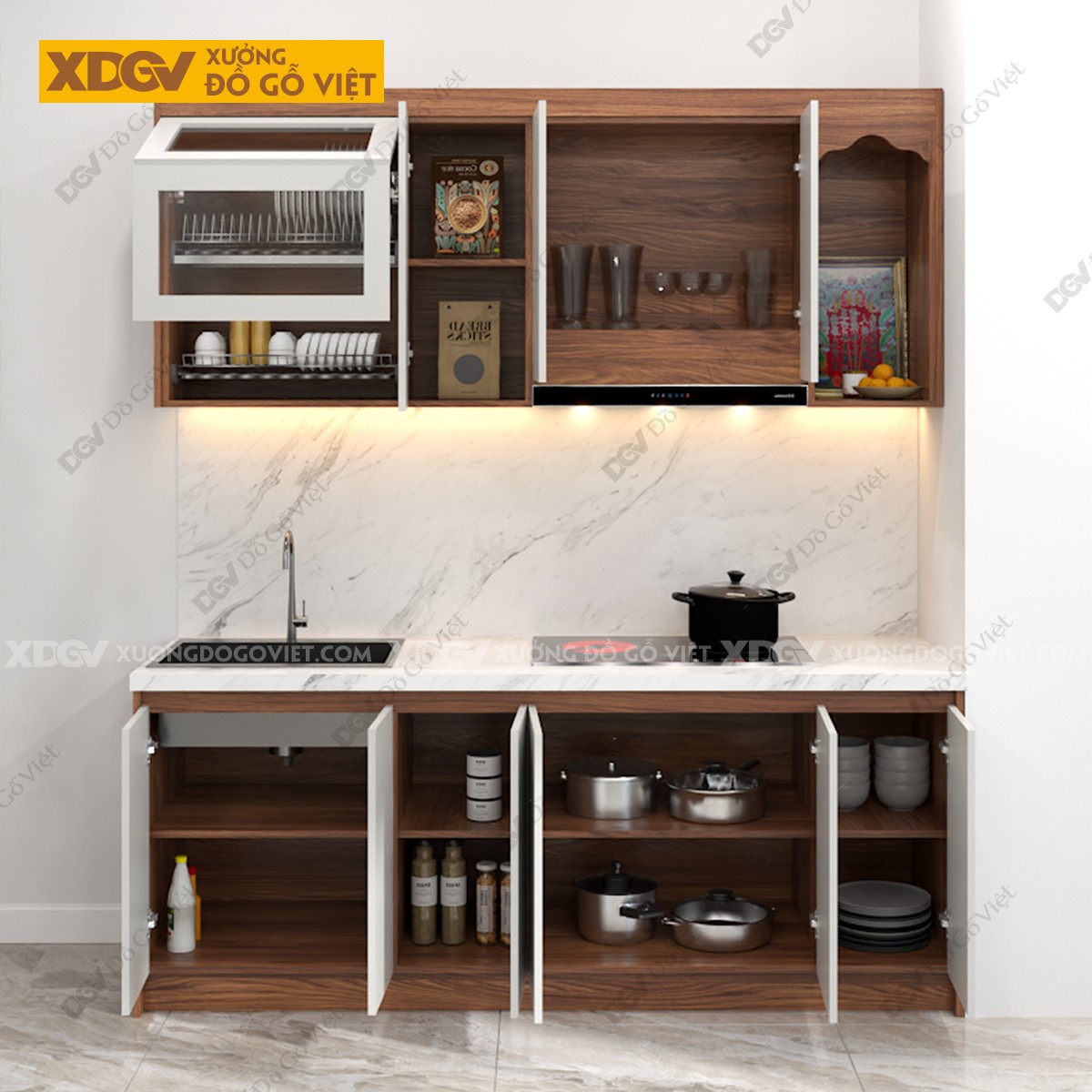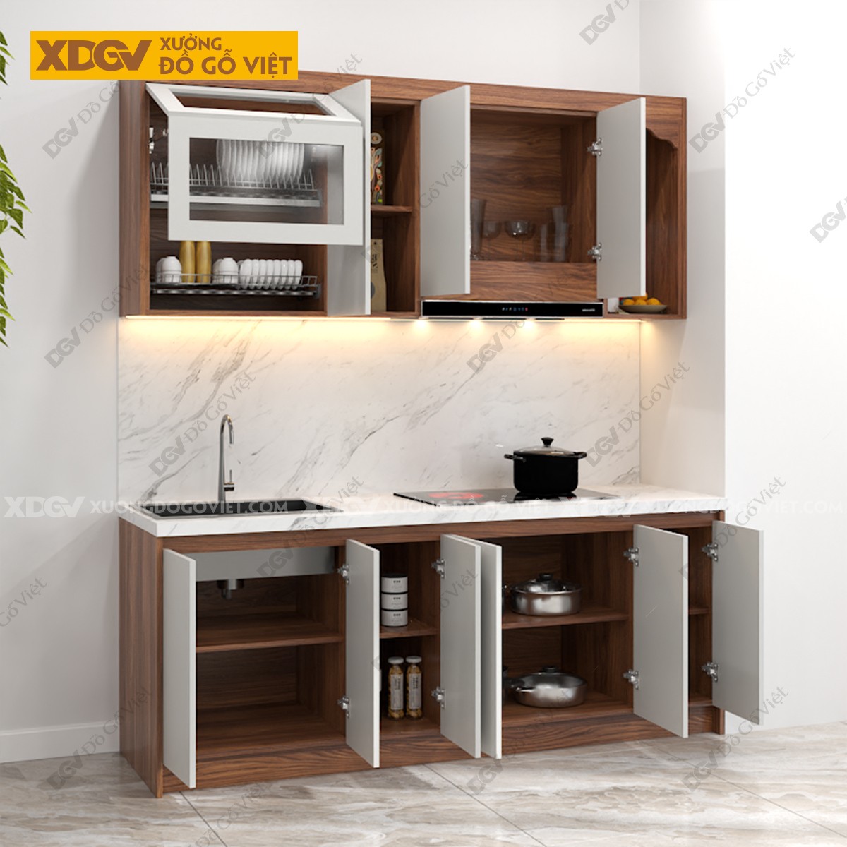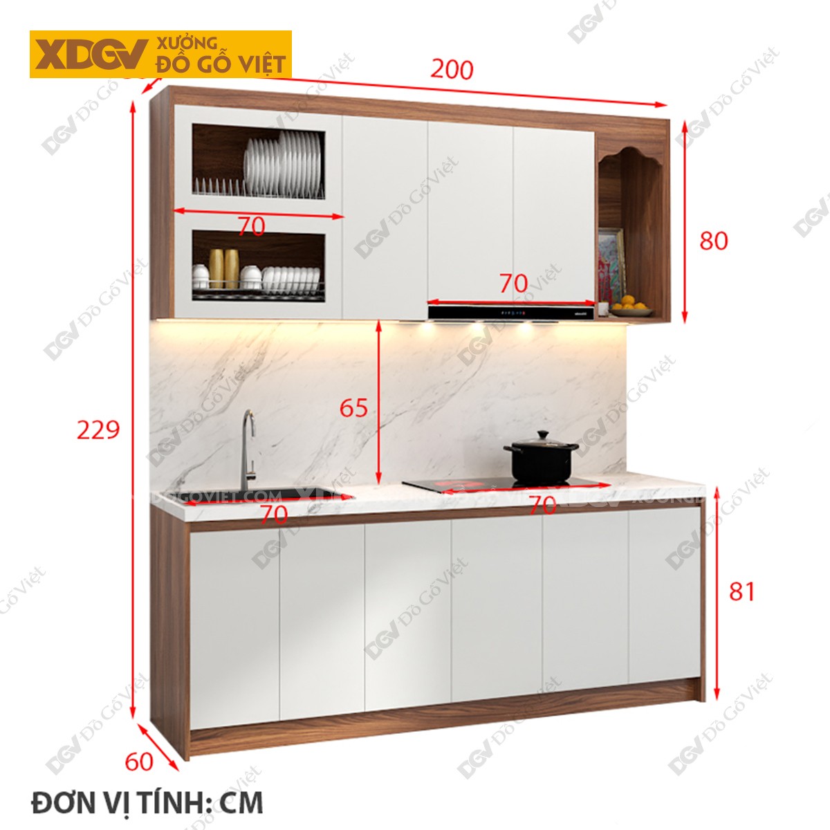 Chất liệu: MDF lõi xanh chống ẩm phủ Melamine chống trầy. Tình trạng: Hàng thi công. Lưu ý: Giá trên chưa bao gồm mặt đá, các phụ kiện và thiết bị bếp.