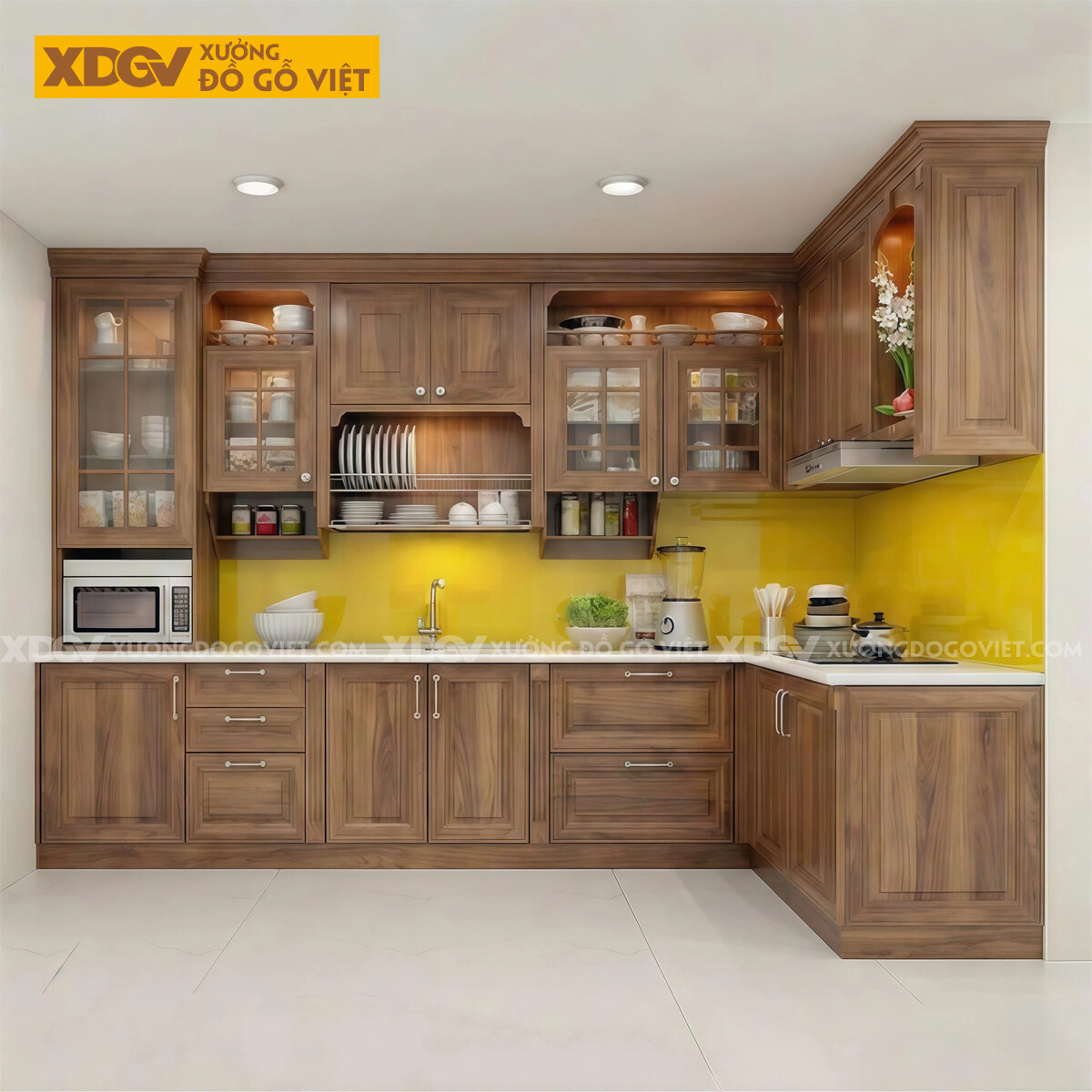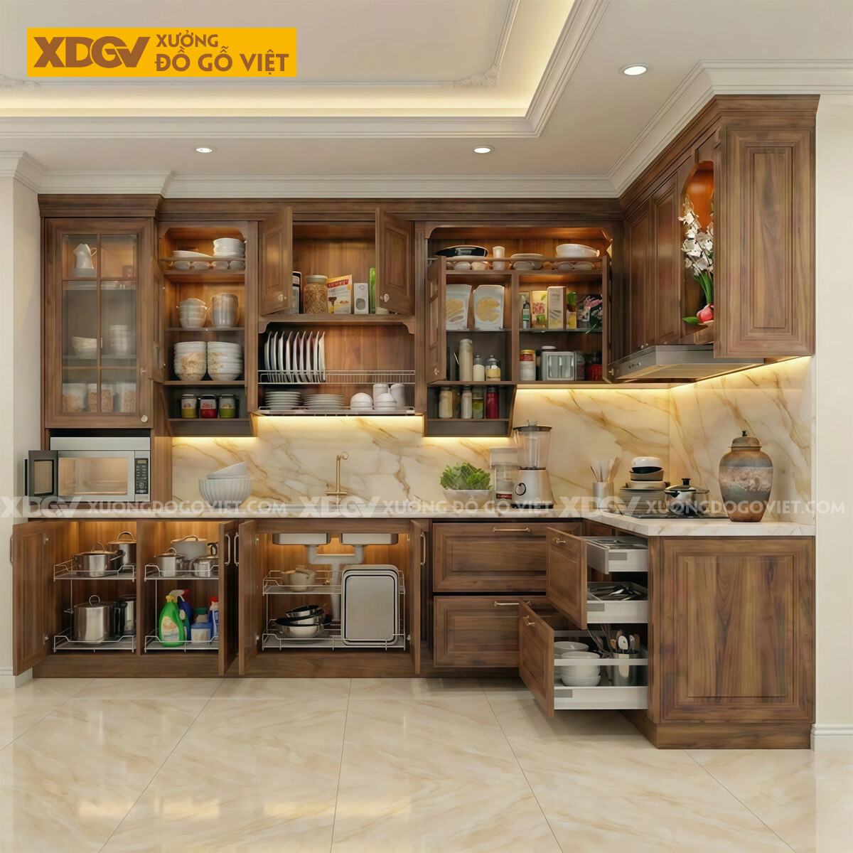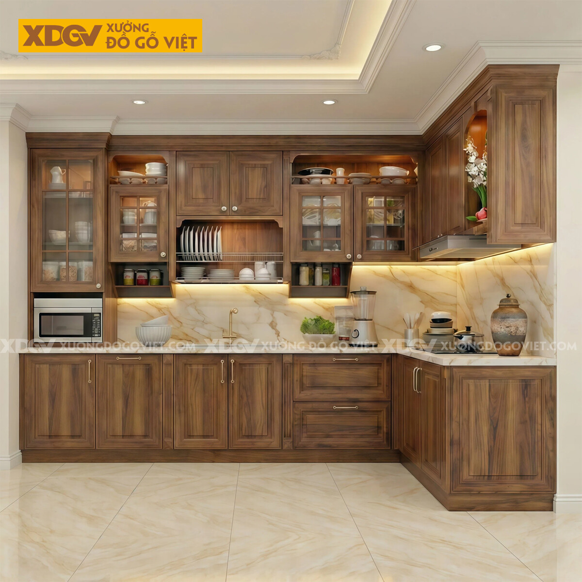 Tủ Bếp Góc L Gỗ Óc Chó Mặt Ốp Đá Nhiều Ngăn Đựng Tiện Lợi