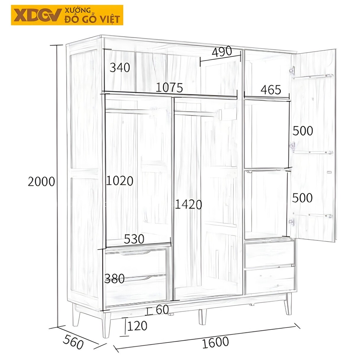 Tủ Áo Quần Đôi Gỗ Óc Chó Thịt Bo Góc Chân Cao Tay Âm Dưới